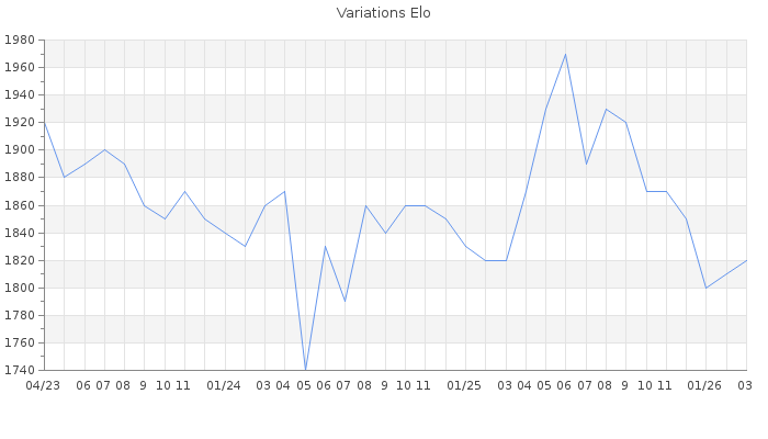 Date d'inscription : 17/06/07. Donateur pour EchecsEmail : Non ( Cliquez ici pour soutenir EchecsEmail. ) Elo non arrondi:1820.6 ( 211 sur 446 joueurs ) Nombre de victoires :3426 Nombre de nulles :328 Nombre de défaites :3356 Temps de réponse moyen par coup : 0J 11H 13M 34S ( Moyenne sur 2085 coups ). Rd ( Un petit rd indique un elo fiable ) : 57 Elo maximum atteint ( en étant classé ) :1970 Elo maximum atteint cette année :1880 Nombre coups joués : 248663 Inscrit dans l' équipe:Royal Kids Classement coupe : 55 Points coupe : 413.98 Classement Coupe Magic Chess : Inactif Points Coupe Magic Chess : 0 Tournoi échelle : Inactif. Tournois gagnés : 30/09/2022 : Cat 4 : Victoire dans le tournoi n°23883 25/07/2020 : Cat 4 : Victoire dans le tournoi n°21455 16/01/2012 : Cat 3 : Victoire dans le tournoi n°9454 14/10/2011 : Cat 3 : Victoire dans le tournoi n°9212 Nombre de tournois gagnés :4