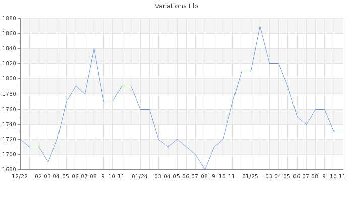 Date d'inscription : 13/11/18. Donateur pour EchecsEmail : Non ( Cliquez ici pour soutenir EchecsEmail. ) Elo non arrondi:1734.7 ( 259 sur 459 joueurs ) Nombre de victoires :843 Nombre de nulles :76 Nombre de défaites :761 Temps de réponse moyen par coup : 0J 5H 23M 42S ( Moyenne sur 1531 coups ). Rd ( Un petit rd indique un elo fiable ) : 58 Magic Elo:1700 Magic Rd : 350 Elo maximum atteint ( en étant classé ) :1870 Elo maximum atteint cette année :1870 Nombre coups joués : 65571 Classement coupe : Inactif Points coupe : 0.03 Classement Coupe Magic Chess : Inactif Points Coupe Magic Chess : 0 Tournoi échelle : Inactif. Tournois gagnés : 16/05/2023 : Cat 3 : Victoire dans le tournoi n°24873 15/09/2022 : Cat 3 : Victoire dans le tournoi n°24203 28/12/2020 : Cat 2 : Victoire dans le tournoi n°22225 07/04/2020 : Cat 3 : Victoire dans le tournoi n°20980 22/12/2019 : Cat 3 : Victoire dans le tournoi n°20410 25/07/2019 : Cat 2 : Victoire dans le tournoi n°19812 18/07/2019 : Cat 3 : Victoire dans le tournoi n°19883 24/02/2019 : Cat 2 : Victoire dans le tournoi n°19341 17/02/2019 : Cat 2 : Victoire dans le tournoi n°19313 Nombre de tournois gagnés :9