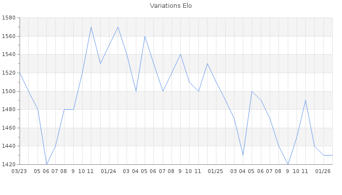 Date d'inscription : 15/11/11. Donateur pour EchecsEmail : Non ( Cliquez ici pour soutenir EchecsEmail. ) Elo non arrondi:1419.5 ( 401 sur 459 joueurs ) Nombre de victoires :752 Nombre de nulles :49 Nombre de défaites :808 Temps de réponse moyen par coup : 0J 3H 11M 58S ( Moyenne sur 1019 coups ). Rd ( Un petit rd indique un elo fiable ) : 62 Elo maximum atteint ( en étant classé ) :1680 Elo maximum atteint cette année :1460 Nombre coups joués : 56930 Classement coupe : Inactif Points coupe : 0 Classement Coupe Magic Chess : Inactif Points Coupe Magic Chess : 0 Tournoi échelle : Tournois gagnés : 04/05/2025 : Cat 1 : Victoire dans le tournoi n°26701 14/09/2022 : Cat 2 : Victoire dans le tournoi n°24195 21/06/2022 : Cat 1 : Victoire dans le tournoi n°23979 14/06/2020 : Cat 1 : Victoire dans le tournoi n°21367 05/05/2019 : Cat 1 : Victoire dans le tournoi n°19518 05/06/2018 : Cat 1 : Victoire dans le tournoi n°18041 12/01/2018 : Cat 1 : Victoire dans le tournoi n°17480 07/03/2017 : Cat 1 : Victoire dans le tournoi n°16224 03/02/2017 : Cat 1 : Victoire dans le tournoi n°15834 07/11/2016 : Cat 1 : Victoire dans le tournoi n°15504 23/12/2014 : Cat 1 : Victoire dans le tournoi n°16474 17/11/2014 : Cat 1 : Victoire dans le tournoi n°16318 11/09/2014 : Cat 1 : Victoire dans le tournoi n°15941 23/08/2014 : Cat 1 : Victoire dans le tournoi n°15621 03/07/2014 : Cat 1 : Victoire dans le tournoi n°15238 03/04/2013 : Cat 2 : Victoire dans le tournoi n°11580 04/02/2012 : Cat 1 : Victoire dans le tournoi n°9659 Nombre de tournois gagnés :17