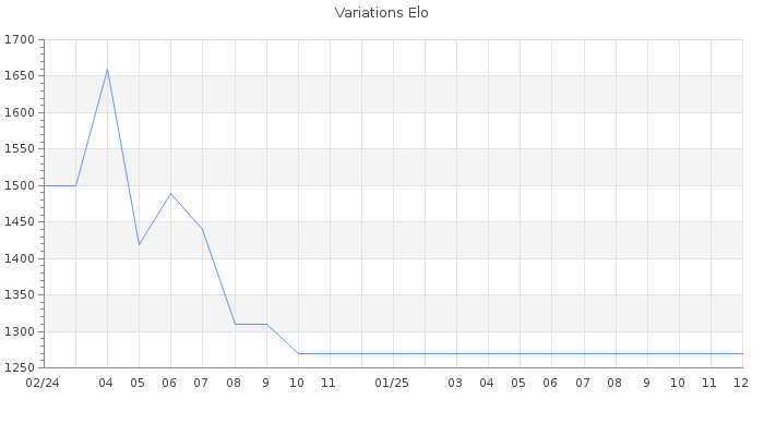 Date d'inscription : 24/02/24. Donateur pour EchecsEmail : Non ( Cliquez ici pour soutenir EchecsEmail. ) Elo non arrondi:1245.8 ( 465 sur 448 joueurs ) Nombre de victoires :4 Nombre de nulles :1 Nombre de défaites :20 Temps de réponse moyen par coup : 1J 2H 19M 13S ( Moyenne sur 0 coups ). Rd ( Un petit rd indique un elo fiable ) : 113 Elo maximum atteint ( en étant classé ) :1440 Elo maximum atteint cette année :0 Nombre coups joués : 370 Classement coupe : Inactif, date de la dernière qualification : 24/03/24 Points coupe : 1.47 Classement Coupe Magic Chess : Inactif Points Coupe Magic Chess : 0 Tournoi échelle : Inactif. Nombre de tournois gagnés :0