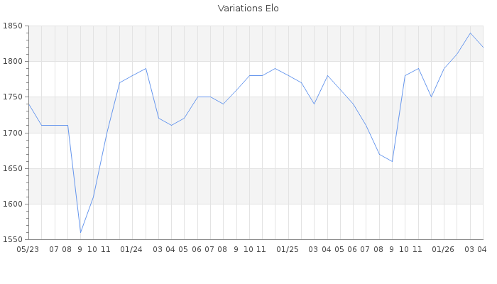Date d'inscription : 22/02/17. Donateur pour EchecsEmail : Non ( Cliquez ici pour soutenir EchecsEmail. ) Elo non arrondi:1821.4 ( 219 sur 452 joueurs ) Nombre de victoires :1258 Nombre de nulles :117 Nombre de défaites :1083 Temps de réponse moyen par coup : 0J 15H 18M 31S ( Moyenne sur 1134 coups ). Rd ( Un petit rd indique un elo fiable ) : 55 Elo maximum atteint ( en étant classé ) :1850 Elo maximum atteint cette année :1850 Nombre coups joués : 104445 Classement coupe : Inactif Points coupe : 0 Classement Coupe Magic Chess : Inactif Points Coupe Magic Chess : 0 Tournoi échelle : Nombre de tournois gagnés :0