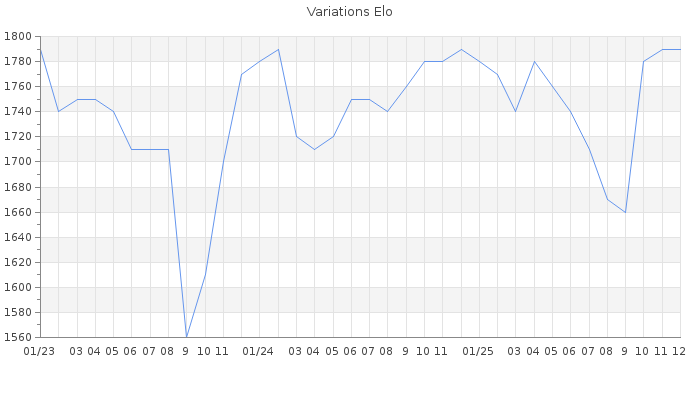 Date d'inscription : 22/02/17. Donateur pour EchecsEmail : Non ( Cliquez ici pour soutenir EchecsEmail. ) Elo non arrondi:1794.1 ( 224 sur 449 joueurs ) Nombre de victoires :1229 Nombre de nulles :113 Nombre de défaites :1054 Temps de réponse moyen par coup : 0J 13H 11M 8S ( Moyenne sur 1276 coups ). Rd ( Un petit rd indique un elo fiable ) : 58 Elo maximum atteint ( en étant classé ) :1840 Elo maximum atteint cette année :1820 Nombre coups joués : 102117 Classement coupe : Inactif Points coupe : 0 Classement Coupe Magic Chess : Inactif Points Coupe Magic Chess : 0 Tournoi échelle : Nombre de tournois gagnés :0