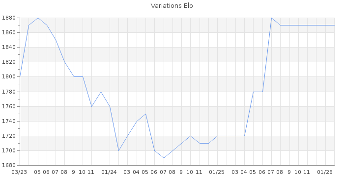 Date d'inscription : 29/09/13. Donateur pour EchecsEmail : Non ( Cliquez ici pour soutenir EchecsEmail. ) Elo non arrondi:1858.1 ( 205 sur 458 joueurs ) Nombre de victoires :450 Nombre de nulles :99 Nombre de défaites :533 Temps de réponse moyen par coup : 0J 12H 59M 5S ( Moyenne sur 6 coups ). Rd ( Un petit rd indique un elo fiable ) : 95 Magic Elo:1600 Magic Rd : 350 Elo maximum atteint ( en étant classé ) :1890 Elo maximum atteint cette année :0 Nombre coups joués : 34232 Classement coupe : Inactif Points coupe : 0.2 Classement Coupe Magic Chess : Inactif Points Coupe Magic Chess : 0 Tournoi échelle : Inactif. Tournois gagnés : 19/07/2025 : Cat 4 : Premier au tournoi multi Eté 2025 n°4 30/03/2024 : Cat 1 : Premier au tournoi multi Saint-Valentin 2024 n°2 04/06/2023 : Cat 3 : Premier au tournoi multi Noël 2022 n°1 25/05/2023 : Cat 4 : Premier au tournoi multi Printemps 2023 n°4 19/02/2023 : Cat 2 : Premier au tournoi multi Noël 2022 n°3 19/02/2023 : Cat 2 : Premier au tournoi multi Halloween 2022 n°1 03/01/2023 : Cat 2 : Premier au tournoi multi Halloween 2022 n°4 22/08/2022 : Cat 2 : Premier au tournoi multi Printemps 2022 n°1 01/05/2022 : Cat 1 : Victoire dans le tournoi n°23635 01/05/2022 : Cat 1 : Premier au tournoi multi Printemps 2022 n°4 29/03/2020 : Cat 2 : Premier au tournoi multi Saint-Valentin 2020 n°4 13/01/2020 : Cat 2 : Premier au tournoi multi Halloween 2019 n°2 15/05/2019 : Cat 2 : Premier au tournoi multi Noël 2018 n°1 15/03/2019 : Cat 2 : Premier au tournoi multi Halloween 2018 n°1 14/02/2019 : Cat 2 : Premier au tournoi multi Noël 2018 n°2 03/01/2019 : Cat 2 : Premier au tournoi multi Halloween 2018 n°3 29/09/2018 : Cat 2 : Victoire dans le tournoi n°18511 23/03/2018 : Cat 2 : Premier au tournoi multi Halloween 2017 n°1 08/01/2018 : Cat 2 : Victoire dans le tournoi n°17405 26/12/2017 : Cat 2 : Premier au tournoi multi Halloween 2017 n°2 03/08/2017 : Cat 2 : Premier au tournoi multi Eté 2017 n°2 24/12/2016 : Cat 0 : Premier au tournoi multi Halloween 2016 n°3 17/08/2016 : Cat 0 : Premier au tournoi multi Eté 2016 n°3 01/04/2016 : Cat 0 : Premier au tournoi multi Saint-Valentin 2016 n°5 29/03/2016 : Cat 2 : Victoire dans le tournoi n°14081 14/01/2016 : Cat 2 : Victoire dans le tournoi n°18851 08/12/2015 : Cat 2 : Victoire dans le tournoi n°18565 28/08/2015 : Cat 0 : Premier au tournoi multi Eté 2015 n°4 10/08/2015 : Cat 0 : Premier au tournoi multi Eté 2015 n°9 01/05/2015 : Cat 2 : Victoire dans le tournoi n°17120 08/02/2015 : Cat 1 : Victoire dans le tournoi n°16944 07/10/2014 : Cat 2 : Victoire dans le tournoi n°15611 28/06/2014 : Cat 2 : Victoire dans le tournoi n°15425 23/02/2014 : Cat 2 : Victoire dans le tournoi n°14548 Nombre de tournois gagnés :49