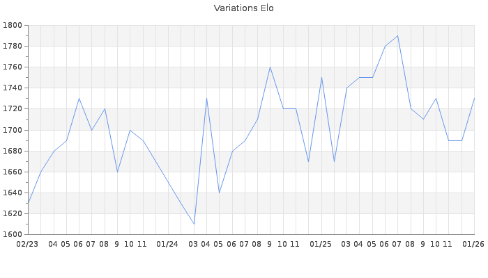 Date d'inscription : 15/03/12. Donateur pour EchecsEmail : Non ( Cliquez ici pour soutenir EchecsEmail. ) Elo non arrondi:1733.2 ( 264 sur 462 joueurs ) Nombre de victoires :6838 Nombre de nulles :1874 Nombre de défaites :7686 Temps de réponse moyen par coup : 0J 3H 10M 29S ( Moyenne sur 7810 coups ). Rd ( Un petit rd indique un elo fiable ) : 50 Magic Elo:1600 Magic Rd : 350 Elo maximum atteint ( en étant classé ) :1990 Elo maximum atteint cette année :1760 Nombre coups joués : 629844 Inscrit dans l' équipe:Royal Kids Classement coupe : 52 Points coupe : 512.89 Classement Coupe Magic Chess : Inactif Points Coupe Magic Chess : 0 Tournoi échelle : Inactif. Tournois gagnés : 25/01/2026 : Cat 3 : Victoire dans le tournoi n°27390 11/01/2026 : Cat 2 : Victoire dans le tournoi n°27252 05/01/2026 : Cat 2 : Victoire dans le tournoi n°27200 25/11/2025 : Cat 3 : Victoire dans le tournoi n°27209 08/07/2025 : Cat 3 : Victoire dans le tournoi n°26848 23/06/2025 : Cat 3 : Victoire dans le tournoi n°26829 12/03/2025 : Cat 3 : Victoire dans le tournoi n°26549 28/01/2025 : Cat 2 : Victoire dans le tournoi n°26393 09/01/2025 : Cat 3 : Victoire dans le tournoi n°26085 16/11/2024 : Cat 2 : Victoire dans le tournoi n°25902 22/10/2024 : Cat 3 : Victoire dans le tournoi n°26154 15/10/2024 : Cat 3 : Victoire dans le tournoi n°26032 21/09/2024 : Cat 3 : Victoire dans le tournoi n°26106 29/08/2024 : Cat 2 : Victoire dans le tournoi n°25992 23/07/2024 : Cat 3 : Victoire dans le tournoi n°25910 07/07/2024 : Cat 2 : Victoire dans le tournoi n°25891 26/06/2024 : Cat 2 : Victoire dans le tournoi n°25853 22/04/2024 : Cat 2 : Victoire dans le tournoi n°25772 20/04/2024 : Cat 2 : Victoire dans le tournoi n°25751 05/04/2024 : Cat 2 : Victoire dans le tournoi n°25715 22/02/2024 : Cat 2 : Victoire dans le tournoi n°25618 16/02/2024 : Cat 3 : Victoire dans le tournoi n°25531 13/02/2024 : Cat 2 : Victoire dans le tournoi n°25451 25/01/2024 : Cat 2 : Victoire dans le tournoi n°25517 03/12/2023 : Cat 3 : Victoire dans le tournoi n°24922 25/08/2023 : Cat 3 : Victoire dans le tournoi n°25043 30/07/2023 : Cat 3 : Victoire dans le tournoi n°25091 23/05/2023 : Cat 2 : Victoire dans le tournoi n°24868 24/04/2023 : Cat 2 : Victoire dans le tournoi n°24829 22/04/2023 : Cat 2 : Victoire dans le tournoi n°24777 28/03/2023 : Cat 2 : Victoire dans le tournoi n°24743 15/03/2023 : Cat 2 : Victoire dans le tournoi n°24712 25/01/2023 : Cat 2 : Victoire dans le tournoi n°24588 22/01/2023 : Cat 2 : Victoire dans le tournoi n°24469 08/01/2023 : Cat 3 : Victoire dans le tournoi n°24501 26/12/2022 : Cat 3 : Victoire dans le tournoi n°24487 18/11/2022 : Cat 2 : Victoire dans le tournoi n°24421 23/10/2022 : Cat 2 : Victoire dans le tournoi n°24183 19/10/2022 : Cat 2 : Victoire dans le tournoi n°24335 10/09/2022 : Cat 3 : Victoire dans le tournoi n°24224 10/08/2022 : Cat 3 : Victoire dans le tournoi n°24143 26/07/2022 : Cat 3 : Victoire dans le tournoi n°24121 28/05/2022 : Cat 3 : Victoire dans le tournoi n°23959 30/03/2022 : Cat 2 : Victoire dans le tournoi n°23766 19/03/2022 : Cat 2 : Victoire dans le tournoi n°23664 08/02/2022 : Cat 2 : Victoire dans le tournoi n°23618 06/01/2022 : Cat 2 : Victoire dans le tournoi n°23399 05/01/2022 : Cat 2 : Victoire dans le tournoi n°23487 23/08/2021 : Cat 2 : Victoire dans le tournoi n°22636 15/08/2021 : Cat 3 : Victoire dans le tournoi n°22923 30/07/2021 : Cat 3 : Victoire dans le tournoi n°22952 09/07/2021 : Cat 2 : Victoire dans le tournoi n°22822 18/06/2021 : Cat 3 : Victoire dans le tournoi n°22685 17/06/2021 : Cat 3 : Victoire dans le tournoi n°22863 07/05/2021 : Cat 2 : Victoire dans le tournoi n°22654 19/04/2021 : Cat 2 : Victoire dans le tournoi n°22650 04/04/2021 : Cat 2 : Victoire dans le tournoi n°22599 17/03/2021 : Cat 2 : Victoire dans le tournoi n°22520 26/12/2020 : Cat 3 : Victoire dans le tournoi n°22011 02/10/2020 : Cat 3 : Victoire dans le tournoi n°21809 30/09/2020 : Cat 2 : Victoire dans le tournoi n°21764 22/08/2020 : Cat 2 : Victoire dans le tournoi n°21516 13/05/2020 : Cat 2 : Victoire dans le tournoi n°21242 06/05/2020 : Cat 2 : Victoire dans le tournoi n°21199 20/04/2020 : Cat 2 : Victoire dans le tournoi n°21074 08/04/2020 : Cat 2 : Victoire dans le tournoi n°20701 16/02/2020 : Cat 2 : Victoire dans le tournoi n°20749 14/12/2019 : Cat 2 : Victoire dans le tournoi n°20408 09/12/2019 : Cat 3 : Victoire dans le tournoi n°20497 14/10/2019 : Cat 3 : Victoire dans le tournoi n°20190 18/09/2019 : Cat 3 : Victoire dans le tournoi n°20127 13/09/2019 : Cat 3 : Victoire dans le tournoi n°20001 06/09/2019 : Cat 3 : Victoire dans le tournoi n°19903 02/05/2019 : Cat 2 : Victoire dans le tournoi n°19553 11/04/2019 : Cat 2 : Victoire dans le tournoi n°19390 09/04/2019 : Cat 2 : Victoire dans le tournoi n°19515 03/02/2019 : Cat 2 : Victoire dans le tournoi n°19216 10/01/2019 : Cat 2 : Victoire dans le tournoi n°19125 25/12/2018 : Cat 2 : Victoire dans le tournoi n°19097 19/12/2018 : Cat 2 : Victoire dans le tournoi n°19004 09/12/2018 : Cat 2 : Victoire dans le tournoi n°19016 30/11/2018 : Cat 2 : Victoire dans le tournoi n°18920 17/11/2018 : Cat 3 : Victoire dans le tournoi n°18908 28/10/2018 : Cat 2 : Victoire dans le tournoi n°18520 13/09/2018 : Cat 3 : Victoire dans le tournoi n°18615 11/09/2018 : Cat 3 : Victoire dans le tournoi n°18497 27/08/2018 : Cat 2 : Victoire dans le tournoi n°18442 20/06/2018 : Cat 2 : Victoire dans le tournoi n°18081 11/04/2018 : Cat 2 : Victoire dans le tournoi n°17718 07/03/2018 : Cat 2 : Victoire dans le tournoi n°17642 04/03/2018 : Cat 2 : Victoire dans le tournoi n°17433 07/12/2017 : Cat 2 : Victoire dans le tournoi n°17379 30/09/2017 : Cat 2 : Victoire dans le tournoi n°17074 20/09/2017 : Cat 2 : Victoire dans le tournoi n°17059 05/07/2017 : Cat 2 : Victoire dans le tournoi n°16697 04/07/2017 : Cat 2 : Victoire dans le tournoi n°16726 24/06/2017 : Cat 3 : Victoire