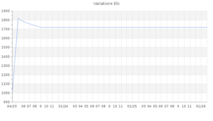 Date d'inscription : 06/04/23. Donateur pour EchecsEmail : Non ( Cliquez ici pour soutenir EchecsEmail. ) Elo non arrondi:1685.6 ( 316 sur 451 joueurs ) Nombre de victoires :25 Nombre de nulles :1 Nombre de défaites :14 Temps de réponse moyen par coup : 0J 8H 10M 13S ( Moyenne sur 0 coups ). Rd ( Un petit rd indique un elo fiable ) : 77 Elo maximum atteint ( en étant classé ) :1820 Elo maximum atteint cette année :0 Nombre coups joués : 1105 Classement coupe : Inactif, date de la dernière qualification : 20/07/23 Points coupe : 9.67 Classement Coupe Magic Chess : Inactif Points Coupe Magic Chess : 0 Tournoi échelle : Tournois gagnés : 06/06/2023 : Cat 2 : Victoire dans le tournoi n°24933 31/05/2023 : Cat 1 : Victoire dans le tournoi n°24856 29/05/2023 : Cat 0 : Victoire dans le tournoi n°24834 21/05/2023 : Cat 0 : Victoire dans le tournoi n°24789 Nombre de tournois gagnés :4