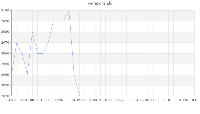 Date d'inscription : 30/01/22. Donateur pour EchecsEmail : Non ( Cliquez ici pour soutenir EchecsEmail. ) Elo non arrondi:1990.7 ( 145 sur 448 joueurs ) Nombre de victoires :121 Nombre de nulles :18 Nombre de défaites :47 Temps de réponse moyen par coup : 0J 6H 37M 17S ( Moyenne sur 0 coups ). Rd ( Un petit rd indique un elo fiable ) : 80 Magic Elo:1700 Magic Rd : 350 Elo maximum atteint ( en étant classé ) :2100 Elo maximum atteint cette année :0 Nombre coups joués : 7301 Classement coupe : Inactif Points coupe : 0 Classement Coupe Magic Chess : Inactif Points Coupe Magic Chess : 0 Tournoi échelle : Inactif. Tournois gagnés : 31/12/2022 : Cat 4 : Victoire dans le tournoi n°24477 28/12/2022 : Cat 5 : Victoire dans le tournoi n°24415 29/10/2022 : Cat 4 : Victoire dans le tournoi n°24286 19/09/2022 : Cat 4 : Victoire dans le tournoi n°24197 24/02/2022 : Cat 1 : Victoire dans le tournoi n°23639 20/02/2022 : Cat 2 : Victoire dans le tournoi n°23646 14/02/2022 : Cat 1 : Victoire dans le tournoi n°23613 Nombre de tournois gagnés :7