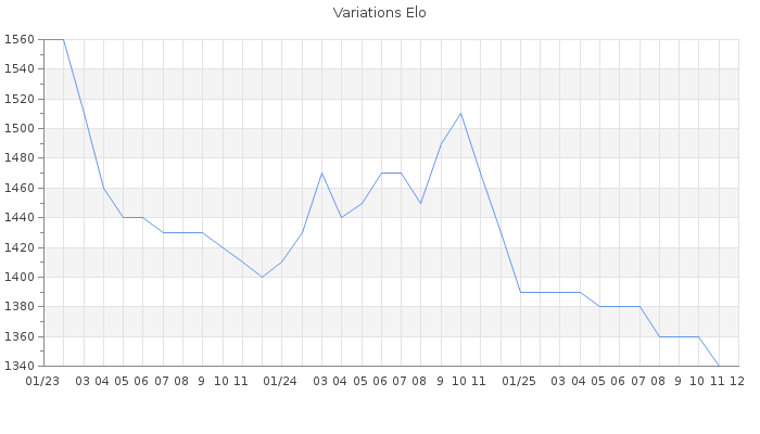 Date d'inscription : 27/02/10. Donateur pour EchecsEmail : Non ( Cliquez ici pour soutenir EchecsEmail. ) Elo non arrondi:1340.2 ( 418 sur 448 joueurs ) Nombre de victoires :350 Nombre de nulles :54 Nombre de défaites :1319 Temps de réponse moyen par coup : 0J 9H 35M 24S ( Moyenne sur 401 coups ). Rd ( Un petit rd indique un elo fiable ) : 130 Magic Elo:1600 Magic Rd : 350 Elo maximum atteint ( en étant classé ) :1680 Elo maximum atteint cette année :1430 Nombre coups joués : 74170 Classement coupe : Inactif Points coupe : 0 Classement Coupe Magic Chess : Inactif Points Coupe Magic Chess : 0 Tournoi échelle : Tournois gagnés : 13/02/2023 : Cat 2 : Victoire dans le tournoi n°24399 Nombre de tournois gagnés :1