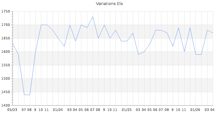 Date d'inscription : 26/12/08. Donateur pour EchecsEmail : Oui ( Cliquez ici pour soutenir EchecsEmail. ) Elo non arrondi:1671.7 ( 273 sur 446 joueurs ) Nombre de victoires :17123 Nombre de nulles :2164 Nombre de défaites :21479 Temps de réponse moyen par coup : 0J 0H 48M 52S ( Moyenne sur 12857 coups ). Rd ( Un petit rd indique un elo fiable ) : 57 Magic Elo:1600 Magic Rd : 350 Elo maximum atteint ( en étant classé ) :1810 Elo maximum atteint cette année :1700 Nombre coups joués : 1438985 Classement coupe : Inactif, date de la dernière qualification : 04/09/22 Points coupe : 5.22 Classement Coupe Magic Chess : Inactif Points Coupe Magic Chess : 0 Tournoi échelle : Inactif. Tournois gagnés : 23/03/2026 : Cat 2 : Victoire dans le tournoi n°27553 21/03/2026 : Cat 2 : Victoire dans le tournoi n°27496 14/03/2026 : Cat 2 : Victoire dans le tournoi n°27494 13/03/2026 : Cat 2 : Victoire dans le tournoi n°27521 11/03/2026 : Cat 2 : Victoire dans le tournoi n°27417 01/03/2026 : Cat 2 : Victoire dans le tournoi n°27433 26/02/2026 : Cat 2 : Victoire dans le tournoi n°27446 17/02/2026 : Cat 2 : Victoire dans le tournoi n°27463 15/02/2026 : Cat 2 : Victoire dans le tournoi n°27456 11/02/2026 : Cat 2 : Victoire dans le tournoi n°27410 08/02/2026 : Cat 2 : Victoire dans le tournoi n°27404 02/02/2026 : Cat 2 : Victoire dans le tournoi n°27342 31/01/2026 : Cat 2 : Victoire dans le tournoi n°27384 27/01/2026 : Cat 2 : Victoire dans le tournoi n°27392 19/01/2026 : Cat 2 : Victoire dans le tournoi n°27361 10/01/2026 : Cat 2 : Victoire dans le tournoi n°27368 10/01/2026 : Cat 2 : Victoire dans le tournoi n°27330 04/01/2026 : Cat 2 : Victoire dans le tournoi n°27336 29/12/2025 : Cat 2 : Victoire dans le tournoi n°27311 26/12/2025 : Cat 2 : Victoire dans le tournoi n°27326 25/12/2025 : Cat 2 : Victoire dans le tournoi n°27331 09/12/2025 : Cat 2 : Victoire dans le tournoi n°27253 08/12/2025 : Cat 2 : Victoire dans le tournoi n°27270 24/11/2025 : Cat 2 : Victoire dans le tournoi n°27224 22/11/2025 : Cat 2 : Victoire dans le tournoi n°27194 18/11/2025 : Cat 2 : Victoire dans le tournoi n°27217 15/11/2025 : Cat 2 : Victoire dans le tournoi n°27229 15/11/2025 : Cat 2 : Victoire dans le tournoi n°27218 11/11/2025 : Cat 3 : Victoire dans le tournoi n°27174 10/11/2025 : Cat 3 : Victoire dans le tournoi n°27162 04/11/2025 : Cat 2 : Victoire dans le tournoi n°27141 01/11/2025 : Cat 2 : Victoire dans le tournoi n°27029 28/10/2025 : Cat 2 : Victoire dans le tournoi n°27154 18/10/2025 : Cat 3 : Victoire dans le tournoi n°27136 13/10/2025 : Cat 2 : Victoire dans le tournoi n°27104 10/10/2025 : Cat 2 : Victoire dans le tournoi n°27113 08/10/2025 : Cat 2 : Victoire dans le tournoi n°27094 22/09/2025 : Cat 2 : Victoire dans le tournoi n°27073 10/09/2025 : Cat 2 : Victoire dans le tournoi n°27039 09/09/2025 : Cat 3 : Victoire dans le tournoi n°27023 07/09/2025 : Cat 2 : Victoire dans le tournoi n°27030 02/07/2025 : Cat 2 : Victoire dans le tournoi n°26723 26/06/2025 : Cat 2 : Victoire dans le tournoi n°26845 19/06/2025 : Cat 2 : Victoire dans le tournoi n°26839 17/06/2025 : Cat 2 : Victoire dans le tournoi n°26828 14/06/2025 : Cat 3 : Victoire dans le tournoi n°26810 02/06/2025 : Cat 2 : Victoire dans le tournoi n°26793 29/05/2025 : Cat 2 : Victoire dans le tournoi n°26783 10/05/2025 : Cat 2 : Victoire dans le tournoi n°26705 02/05/2025 : Cat 2 : Victoire dans le tournoi n°26715 21/04/2025 : Cat 3 : Victoire dans le tournoi n°26687 07/03/2025 : Cat 3 : Victoire dans le tournoi n°26541 22/02/2025 : Cat 2 : Victoire dans le tournoi n°26486 17/02/2025 : Cat 2 : Victoire dans le tournoi n°26510 09/02/2025 : Cat 2 : Victoire dans le tournoi n°26456 29/12/2024 : Cat 2 : Victoire dans le tournoi n°26345 26/12/2024 : Cat 3 : Victoire dans le tournoi n°26315 22/12/2024 : Cat 3 : Victoire dans le tournoi n°26357 14/12/2024 : Cat 3 : Victoire dans le tournoi n°26295 26/11/2024 : Cat 2 : Victoire dans le tournoi n°26181 19/11/2024 : Cat 2 : Victoire dans le tournoi n°26239 16/11/2024 : Cat 3 : Victoire dans le tournoi n°26242 15/11/2024 : Cat 2 : Victoire dans le tournoi n°26231 08/11/2024 : Cat 3 : Victoire dans le tournoi n°26226 28/10/2024 : Cat 2 : Victoire dans le tournoi n°26147 27/09/2024 : Cat 2 : Victoire dans le tournoi n°26081 27/06/2024 : Cat 2 : Victoire dans le tournoi n°25869 28/05/2024 : Cat 2 : Victoire dans le tournoi n°25825 24/05/2024 : Cat 2 : Victoire dans le tournoi n°25839 23/05/2024 : Cat 2 : Victoire dans le tournoi n°25746 11/05/2024 : Cat 2 : Victoire dans le tournoi n°25778 28/04/2024 : Cat 2 : Victoire dans le tournoi n°25754 27/04/2024 : Cat 2 : Victoire dans le tournoi n°25727 22/04/2024 : Cat 2 : Victoire dans le tournoi n°25734 21/04/2024 : Cat 2 : Victoire dans le tournoi n°25652 14/04/2024 : Cat 2 : Victoire dans le tournoi n°25738 09/04/2024 : Cat 2 : Victoire dans le tournoi n°25636 08/04/2024 : Cat 2 : Victoire dans le tournoi n°25721 06/04/2024 : Cat 2 : Victoire dans le tournoi n°25729 02/04/2024 : Cat 2 : Victoire dans le tournoi n°25723 01/04/2024 : Cat 2 : Victoire dans le tournoi n°25708 22/03/2024 : Cat 2 : Victoire dans le tournoi n°25664 11/03/2024 : Cat 2 : Victoire dans le tournoi n°25654 06/03/2024 : Cat 2 : Victoire dans le tournoi n°25646 29/02/2024 : Cat 2 : Victoire dans le tournoi n°25588 25/02/2024 : Cat 2 : Victoire dans le tournoi n°25600 24/01/2024 : Cat 2 : Victoire dans le tournoi n°25535 22/01/2024 : Cat 2 : Victoire dans le tournoi n°25515 13/01/2024 : Cat 2 : Victoire dans le tournoi n°25482 10/01/2024 : Cat 2 : Victoire dans le tournoi n°25508 06/01/2024 : Cat 2 : Victoire dans le tournoi n°25484 02/01/2024 : Cat 2 : Victoire dans le tournoi n°25468 01/01/2024 : Cat 2 : Victoire dans le tournoi n°25476 18/12/2023 : Cat 2 : Victoire dans le tournoi n°25407 01/12/2023 : Cat 3 : Victoire dans le tournoi n°25408 07/11/2022 : Cat 2 : Victoire dans le tournoi n°24353 21/10/2022