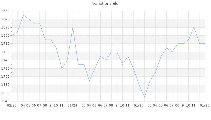 Date d'inscription : 27/09/21. Donateur pour EchecsEmail : Non ( Cliquez ici pour soutenir EchecsEmail. ) Elo non arrondi:1775.9 ( 244 sur 462 joueurs ) Nombre de victoires :249 Nombre de nulles :49 Nombre de défaites :247 Temps de réponse moyen par coup : 0J 4H 59M 17S ( Moyenne sur 590 coups ). Rd ( Un petit rd indique un elo fiable ) : 62 Elo maximum atteint ( en étant classé ) :1890 Elo maximum atteint cette année :1800 Nombre coups joués : 20252 Inscrit dans l' équipe:No Game No Life Classement coupe : Inactif Points coupe : 0 Classement Coupe Magic Chess : Inactif Points Coupe Magic Chess : 0 Tournoi échelle : Inactif. Tournois gagnés : 12/12/2025 : Cat 3 : Victoire dans le tournoi n°27234 08/10/2025 : Cat 3 : Victoire dans le tournoi n°26970 15/05/2025 : Cat 3 : Victoire dans le tournoi n°26738 27/04/2025 : Cat 3 : Victoire dans le tournoi n°26562 12/11/2024 : Cat 3 : Victoire dans le tournoi n°26209 15/08/2024 : Cat 3 : Victoire dans le tournoi n°25959 15/06/2024 : Cat 3 : Victoire dans le tournoi n°25831 25/12/2023 : Cat 3 : Victoire dans le tournoi n°25447 15/10/2023 : Cat 3 : Victoire dans le tournoi n°25264 23/09/2023 : Cat 3 : Victoire dans le tournoi n°25222 16/07/2023 : Cat 3 : Victoire dans le tournoi n°24977 15/06/2023 : Cat 3 : Victoire dans le tournoi n°24919 16/01/2023 : Cat 3 : Victoire dans le tournoi n°24564 27/11/2022 : Cat 4 : Victoire dans le tournoi n°24334 Nombre de tournois gagnés :14