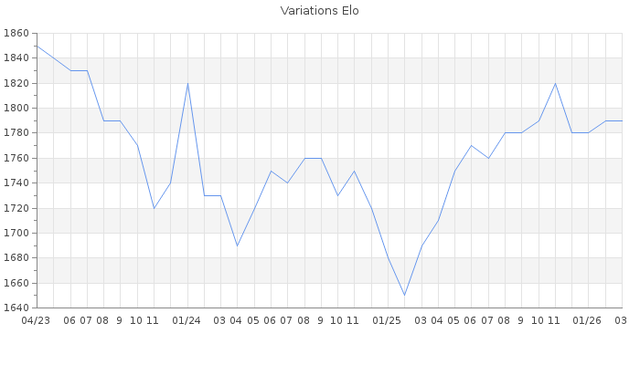 Date d'inscription : 27/09/21. Donateur pour EchecsEmail : Non ( Cliquez ici pour soutenir EchecsEmail. ) Elo non arrondi:1790.2 ( 228 sur 440 joueurs ) Nombre de victoires :253 Nombre de nulles :51 Nombre de défaites :251 Temps de réponse moyen par coup : 0J 4H 43M 51S ( Moyenne sur 479 coups ). Rd ( Un petit rd indique un elo fiable ) : 68 Elo maximum atteint ( en étant classé ) :1890 Elo maximum atteint cette année :1810 Nombre coups joués : 20500 Inscrit dans l' équipe:No Game No Life Classement coupe : Inactif Points coupe : 0 Classement Coupe Magic Chess : Inactif Points Coupe Magic Chess : 0 Tournoi échelle : Inactif. Tournois gagnés : 12/12/2025 : Cat 3 : Victoire dans le tournoi n°27234 08/10/2025 : Cat 3 : Victoire dans le tournoi n°26970 15/05/2025 : Cat 3 : Victoire dans le tournoi n°26738 27/04/2025 : Cat 3 : Victoire dans le tournoi n°26562 12/11/2024 : Cat 3 : Victoire dans le tournoi n°26209 15/08/2024 : Cat 3 : Victoire dans le tournoi n°25959 15/06/2024 : Cat 3 : Victoire dans le tournoi n°25831 25/12/2023 : Cat 3 : Victoire dans le tournoi n°25447 15/10/2023 : Cat 3 : Victoire dans le tournoi n°25264 23/09/2023 : Cat 3 : Victoire dans le tournoi n°25222 16/07/2023 : Cat 3 : Victoire dans le tournoi n°24977 15/06/2023 : Cat 3 : Victoire dans le tournoi n°24919 16/01/2023 : Cat 3 : Victoire dans le tournoi n°24564 27/11/2022 : Cat 4 : Victoire dans le tournoi n°24334 Nombre de tournois gagnés :14