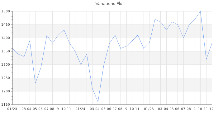Date d'inscription : 25/08/13. Donateur pour EchecsEmail : Non ( Cliquez ici pour soutenir EchecsEmail. ) Elo non arrondi:1380.4 ( 406 sur 449 joueurs ) Nombre de victoires :3797 Nombre de nulles :176 Nombre de défaites :9118 Temps de réponse moyen par coup : 0J 14H 4M 15S ( Moyenne sur 13089 coups ). Rd ( Un petit rd indique un elo fiable ) : 50 Magic Elo:1417.42 Magic Rd : 182 Elo maximum atteint ( en étant classé ) :1630 Elo maximum atteint cette année :1550 Nombre coups joués : 425182 Inscrit dans l' équipe:fouschess Classement coupe : 166 Points coupe : 3.28 Classement Coupe Magic Chess : Inactif Points Coupe Magic Chess : 0 Tournoi échelle : Inactif. Tournois gagnés : 04/11/2025 : Cat 1 : Premier au tournoi multi Automne 2025 n°3 28/04/2025 : Cat 2 : Premier au tournoi multi Printemps 2025 n°2 24/12/2024 : Cat 1 : Victoire dans le tournoi n°26248 10/12/2024 : Cat 1 : Premier au tournoi multi Halloween 2024 n°2 14/12/2023 : Cat 1 : Victoire dans le tournoi n°25369 05/04/2023 : Cat 0 : Victoire CC Fev23 Asc 26/10/2020 : Cat 1 : Victoire CC Juil20 Asc 30/06/2020 : Cat 0 : Victoire CC Mai20 Asc 08/11/2018 : Cat 0 : Victoire CC Oct18 Asc 26/11/2014 : Cat 1 : Victoire dans le tournoi n°16430 14/09/2014 : Cat 1 : Victoire dans le tournoi n°15406 Nombre de tournois gagnés :14