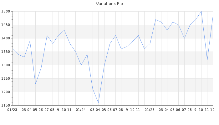 Date d'inscription : 25/08/13. Donateur pour EchecsEmail : Non ( Cliquez ici pour soutenir EchecsEmail. ) Elo non arrondi:1477.2 ( 382 sur 461 joueurs ) Nombre de victoires :3827 Nombre de nulles :177 Nombre de défaites :9166 Temps de réponse moyen par coup : 0J 13H 4M 54S ( Moyenne sur 12670 coups ). Rd ( Un petit rd indique un elo fiable ) : 50 Magic Elo:1417.42 Magic Rd : 182 Elo maximum atteint ( en étant classé ) :1630 Elo maximum atteint cette année :1550 Nombre coups joués : 427434 Inscrit dans l' équipe:fouschess Classement coupe : 165 Points coupe : 3.28 Classement Coupe Magic Chess : Inactif Points Coupe Magic Chess : 0 Tournoi échelle : Inactif. Tournois gagnés : 23/12/2025 : Cat 1 : Victoire dans le tournoi n°27211 04/11/2025 : Cat 1 : Premier au tournoi multi Automne 2025 n°3 28/04/2025 : Cat 2 : Premier au tournoi multi Printemps 2025 n°2 24/12/2024 : Cat 1 : Victoire dans le tournoi n°26248 10/12/2024 : Cat 1 : Premier au tournoi multi Halloween 2024 n°2 14/12/2023 : Cat 1 : Victoire dans le tournoi n°25369 05/04/2023 : Cat 0 : Victoire CC Fev23 Asc 26/10/2020 : Cat 1 : Victoire CC Juil20 Asc 30/06/2020 : Cat 0 : Victoire CC Mai20 Asc 08/11/2018 : Cat 0 : Victoire CC Oct18 Asc 26/11/2014 : Cat 1 : Victoire dans le tournoi n°16430 14/09/2014 : Cat 1 : Victoire dans le tournoi n°15406 Nombre de tournois gagnés :15