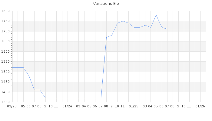 Date d'inscription : 16/05/08. Donateur pour EchecsEmail : Non ( Cliquez ici pour soutenir EchecsEmail. ) Elo non arrondi:1686.4 ( 291 sur 463 joueurs ) Nombre de victoires :385 Nombre de nulles :37 Nombre de défaites :462 Temps de réponse moyen par coup : 0J 13H 4M 25S ( Moyenne sur 11 coups ). Rd ( Un petit rd indique un elo fiable ) : 74 Magic Elo:1600 Magic Rd : 350 Elo maximum atteint ( en étant classé ) :1870 Elo maximum atteint cette année :0 Nombre coups joués : 31090 Classement coupe : Inactif Points coupe : 0 Classement Coupe Magic Chess : Inactif Points Coupe Magic Chess : 0 Tournoi échelle : Inactif. Nombre de tournois gagnés :0