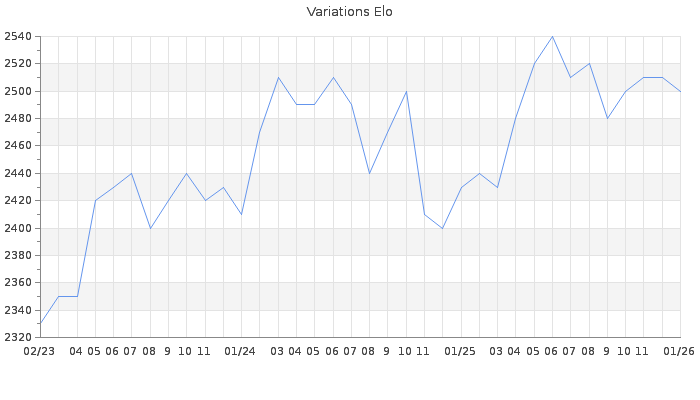 Date d'inscription : 05/02/14. Donateur pour EchecsEmail : Oui ( Cliquez ici pour soutenir EchecsEmail. ) Elo non arrondi:2496.7 ( 26 sur 462 joueurs ) Nombre de victoires :3704 Nombre de nulles :835 Nombre de défaites :1655 Temps de réponse moyen par coup : 0J 2H 54M 48S ( Moyenne sur 405 coups ). Rd ( Un petit rd indique un elo fiable ) : 74 Magic Elo:1700 Magic Rd : 350 Elo maximum atteint ( en étant classé ) :2540 Elo maximum atteint cette année :2520 Nombre coups joués : 213772 Inscrit dans l' équipe:au plaisir du jeux Classement coupe : 28 Points coupe : 1883.81 Classement Coupe Magic Chess : Inactif Points Coupe Magic Chess : 0 Tournoi échelle : Inactif. Tournois gagnés : 25/05/2025 : Cat 6 : Victoire dans le tournoi n°26607 22/12/2024 : Cat 6 : Victoire dans le tournoi n°26205 19/10/2024 : Cat 6 : Victoire dans le tournoi n°26109 15/10/2024 : Cat 6 : Victoire dans le tournoi n°26022 28/09/2024 : Cat 4 : Premier au tournoi multi Automne 2024 n°2 31/03/2024 : Cat 6 : Victoire dans le tournoi n°25627 10/03/2024 : Cat 6 : Victoire dans le tournoi n°25598 10/06/2023 : Cat 6 : Victoire dans le tournoi n°24781 29/12/2022 : Cat 5 : Victoire dans le tournoi n°24482 18/11/2022 : Cat 5 : Victoire dans le tournoi n°24427 18/11/2022 : Cat 5 : Victoire dans le tournoi n°24389 26/04/2022 : Cat 5 : Victoire dans le tournoi n°23829 24/04/2022 : Cat 5 : Victoire dans le tournoi n°23759 24/03/2022 : Cat 5 : Victoire dans le tournoi n°23679 11/03/2022 : Cat 5 : Victoire dans le tournoi n°23621 28/02/2022 : Cat 5 : Victoire dans le tournoi n°23628 14/02/2022 : Cat 5 : Victoire dans le tournoi n°23573 13/01/2022 : Cat 5 : Victoire dans le tournoi n°23497 29/11/2021 : Cat 5 : Victoire dans le tournoi n°23401 28/11/2021 : Cat 5 : Victoire dans le tournoi n°23380 27/08/2021 : Cat 5 : Victoire dans le tournoi n°23047 02/08/2021 : Cat 5 : Victoire dans le tournoi n°22964 27/02/2021 : Cat 5 : Victoire dans le tournoi n°22416 09/01/2021 : Cat 4 : Victoire dans le tournoi n°22195 18/12/2020 : Cat 4 : Victoire dans le tournoi n°22178 14/11/2020 : Cat 4 : Victoire dans le tournoi n°22040 03/11/2020 : Cat 4 : Victoire dans le tournoi n°21855 31/10/2020 : Cat 4 : Victoire dans le tournoi n°21906 16/10/2020 : Cat 4 : Victoire dans le tournoi n°21873 04/10/2020 : Cat 4 : Victoire dans le tournoi n°21712 23/09/2020 : Cat 4 : Victoire dans le tournoi n°21742 09/08/2020 : Cat 4 : Victoire dans le tournoi n°21551 01/07/2020 : Cat 4 : Victoire dans le tournoi n°21383 21/06/2020 : Cat 4 : Victoire dans le tournoi n°21377 30/05/2020 : Cat 4 : Victoire dans le tournoi n°21200 09/04/2020 : Cat 4 : Victoire dans le tournoi n°21073 02/04/2020 : Cat 4 : Victoire dans le tournoi n°21044 21/03/2020 : Cat 4 : Victoire dans le tournoi n°20923 14/03/2020 : Cat 4 : Victoire dans le tournoi n°20849 09/02/2020 : Cat 4 : Victoire dans le tournoi n°20368 05/02/2020 : Cat 4 : Victoire dans le tournoi n°20657 29/01/2020 : Cat 4 : Victoire dans le tournoi n°20587 12/12/2019 : Cat 4 : Victoire dans le tournoi n°20474 02/11/2019 : Cat 4 : Victoire dans le tournoi n°20215 27/10/2019 : Cat 4 : Victoire dans le tournoi n°20291 14/10/2019 : Cat 4 : Victoire dans le tournoi n°20199 10/10/2019 : Cat 4 : Victoire dans le tournoi n°20263 03/10/2019 : Cat 3 : Victoire dans le tournoi n°19990 20/09/2019 : Cat 4 : Victoire dans le tournoi n°20126 12/09/2019 : Cat 4 : Victoire dans le tournoi n°20113 28/08/2019 : Cat 4 : Victoire dans le tournoi n°20065 17/08/2019 : Cat 4 : Victoire dans le tournoi n°20008 06/08/2019 : Cat 4 : Victoire dans le tournoi n°20004 05/08/2019 : Cat 4 : Victoire dans le tournoi n°19904 02/07/2019 : Cat 3 : Victoire dans le tournoi n°19743 14/06/2019 : Cat 3 : Victoire dans le tournoi n°19744 01/06/2019 : Cat 3 : Victoire dans le tournoi n°19735 31/05/2019 : Cat 3 : Victoire dans le tournoi n°19738 26/05/2019 : Cat 3 : Victoire dans le tournoi n°19726 28/04/2019 : Cat 3 : Victoire dans le tournoi n°19507 17/04/2019 : Cat 3 : Victoire dans le tournoi n°19492 29/03/2019 : Cat 3 : Victoire dans le tournoi n°19479 09/03/2019 : Cat 3 : Victoire dans le tournoi n°18955 10/11/2018 : Cat 3 : Victoire dans le tournoi n°18912 06/11/2018 : Cat 3 : Victoire dans le tournoi n°18886 30/10/2018 : Cat 3 : Victoire dans le tournoi n°18456 29/10/2018 : Cat 4 : Victoire dans le tournoi n°18809 17/10/2018 : Cat 4 : Victoire dans le tournoi n°18619 16/10/2018 : Cat 4 : Victoire dans le tournoi n°18756 04/10/2018 : Cat 4 : Victoire dans le tournoi n°18636 22/09/2018 : Cat 4 : Victoire dans le tournoi n°18397 01/09/2018 : Cat 4 : Victoire dans le tournoi n°18599 27/08/2018 : Cat 3 : Victoire dans le tournoi n°18454 23/08/2018 : Cat 3 : Victoire dans le tournoi n°18549 22/08/2018 : Cat 3 : Victoire dans le tournoi n°18311 09/07/2018 : Cat 3 : Victoire dans le tournoi n°18369 08/07/2018 : Cat 3 : Victoire dans le tournoi n°18390 03/07/2018 : Cat 3 : Victoire dans le tournoi n°18370 03/07/2018 : Cat 3 : Victoire dans le tournoi n°18359 27/06/2018 : Cat 3 : Victoire dans le tournoi n°18358 15/06/2018 : Cat 3 : Victoire dans le tournoi n°18240 12/06/2018 : Cat 3 : Victoire dans le tournoi n°18044 06/06/2018 : Cat 3 : Victoire dans le tournoi n°18054 30/05/2018 : Cat 3 : Victoire dans le tournoi n°18187 18/05/2018 : Cat 3 : Victoire dans le tournoi n°18091 04/05/2018 : Cat 3 : Victoire dans le tournoi n°17924 02/05/2018 : Cat 3 : Victoire dans le tournoi n°18069 28/04/2018 : Cat 3 : Victoire dans le tournoi n°17935 27/04/2018 : Cat 3 : Victoire dans le tournoi n°18050 02/04/2018 : Cat 3 : Victoire dans le tournoi n°17910 27/03/2018 : Cat 3 : Victoire dans le tournoi n°17911 28/12/2017 : Cat 3 : Victoire dans le tournoi n°17553 28/12/2017 : Cat 3 : Victoire dans le tournoi n°17551 27/12/2017 : Cat 3 : Victoire dans le tournoi n°17512 17/12/2017 : Cat 3 : Victoire dans le tournoi n°17452 16/12/2017 : Cat 3 : Victoire dans le tournoi n°17434 05/12/2017 : C