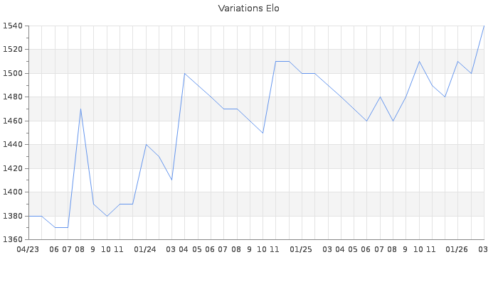Date d'inscription : 12/03/20. Donateur pour EchecsEmail : Non ( Cliquez ici pour soutenir EchecsEmail. ) Elo non arrondi:1536.9 ( 346 sur 446 joueurs ) Nombre de victoires :37 Nombre de nulles :2 Nombre de défaites :97 Temps de réponse moyen par coup : 0J 2H 39M 57S ( Moyenne sur 420 coups ). Rd ( Un petit rd indique un elo fiable ) : 81 Magic Elo:1700 Magic Rd : 350 Elo maximum atteint ( en étant classé ) :1620 Elo maximum atteint cette année :1540 Nombre coups joués : 5658 Classement coupe : Inactif Points coupe : 0 Classement Coupe Magic Chess : Inactif Points Coupe Magic Chess : 0 Tournoi échelle : Nombre de tournois gagnés :0
