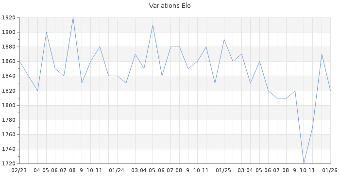 Date d'inscription : 09/10/09. Donateur pour EchecsEmail : Oui ( Cliquez ici pour soutenir EchecsEmail. ) Elo non arrondi:1816.8 ( 224 sur 462 joueurs ) Nombre de victoires :27047 Nombre de nulles :7663 Nombre de défaites :23680 Temps de réponse moyen par coup : 0J 3H 35M 7S ( Moyenne sur 15305 coups ). Rd ( Un petit rd indique un elo fiable ) : 50 Magic Elo:1741.31 Magic Rd : 80 Elo maximum atteint ( en étant classé ) :2070 Elo maximum atteint cette année :1890 Nombre coups joués : 2182642 Classement coupe : 16 Points coupe : 6440.7 Classement Coupe Magic Chess : Inactif Points Coupe Magic Chess : 0 Tournoi échelle : Division 1 : 5 Tournois gagnés : 28/01/2026 : Cat 3 : Victoire dans le tournoi n°27348 19/01/2026 : Cat 3 : Victoire dans le tournoi n°27316 17/01/2026 : Cat 3 : Victoire dans le tournoi n°27334 14/01/2026 : Cat 3 : Victoire dans le tournoi n°27376 11/01/2026 : Cat 3 : Victoire dans le tournoi n°27325 06/01/2026 : Cat 3 : Victoire dans le tournoi n°27312 02/01/2026 : Cat 3 : Victoire dans le tournoi n°27266 02/01/2026 : Cat 3 : Victoire dans le tournoi n°27299 27/12/2025 : Cat 3 : Victoire CC Dec25 Asc 18/12/2025 : Cat 4 : Victoire dans le tournoi n°27265 13/12/2025 : Cat 3 : Victoire dans le tournoi n°27267 08/12/2025 : Cat 3 : Victoire dans le tournoi n°27231 28/11/2025 : Cat 3 : Victoire dans le tournoi n°27244 27/11/2025 : Cat 3 : Victoire dans le tournoi n°27184 25/11/2025 : Cat 3 : Victoire dans le tournoi n°27222 16/11/2025 : Cat 3 : Victoire dans le tournoi n°27170 05/11/2025 : Cat 3 : Victoire dans le tournoi n°27153 01/11/2025 : Cat 3 : Victoire dans le tournoi n°27050 26/10/2025 : Cat 3 : Victoire dans le tournoi n°27147 25/10/2025 : Cat 3 : Victoire dans le tournoi n°27068 14/10/2025 : Cat 3 : Victoire dans le tournoi n°27090 12/10/2025 : Cat 4 : Victoire dans le tournoi n°26966 11/10/2025 : Cat 3 : Victoire dans le tournoi n°27089 08/10/2025 : Cat 4 : Victoire dans le tournoi n°26962 01/10/2025 : Cat 3 : Victoire dans le tournoi n°27075 26/09/2025 : Cat 3 : Victoire dans le tournoi n°27074 25/09/2025 : Cat 3 : Victoire dans le tournoi n°26955 13/09/2025 : Cat 3 : Victoire dans le tournoi n°27053 11/09/2025 : Cat 4 : Victoire dans le tournoi n°27016 03/09/2025 : Cat 3 : Victoire dans le tournoi n°26988 21/08/2025 : Cat 3 : Victoire dans le tournoi n°26980 12/08/2025 : Cat 3 : Victoire dans le tournoi n°26932 08/08/2025 : Cat 3 : Victoire dans le tournoi n°26944 29/07/2025 : Cat 3 : Victoire dans le tournoi n°26840 23/07/2025 : Cat 4 : Victoire dans le tournoi n°26885 18/07/2025 : Cat 3 : Victoire dans le tournoi n°26854 13/07/2025 : Cat 3 : Victoire dans le tournoi n°26855 09/07/2025 : Cat 3 : Victoire dans le tournoi n°26847 01/07/2025 : Cat 3 : Victoire dans le tournoi n°26843 01/07/2025 : Cat 3 : Victoire dans le tournoi n°26820 26/06/2025 : Cat 3 : Victoire dans le tournoi n°26830 24/06/2025 : Cat 4 : Victoire dans le tournoi n°26831 24/06/2025 : Cat 3 : Victoire dans le tournoi n°26799 21/06/2025 : Cat 4 : Victoire dans le tournoi n°26769 12/06/2025 : Cat 3 : Victoire dans le tournoi n°26775 12/06/2025 : Cat 3 : Victoire dans le tournoi n°26763 11/06/2025 : Cat 3 : Victoire dans le tournoi n°26790 04/06/2025 : Cat 3 : Victoire dans le tournoi n°26774 03/06/2025 : Cat 3 : Victoire dans le tournoi n°26681 03/06/2025 : Cat 4 : Victoire dans le tournoi n°26648 02/06/2025 : Cat 3 : Victoire dans le tournoi n°26771 22/05/2025 : Cat 3 : Victoire dans le tournoi n°26756 19/05/2025 : Cat 3 : Victoire dans le tournoi n°26565 19/05/2025 : Cat 3 : Victoire dans le tournoi n°26733 17/05/2025 : Cat 3 : Victoire dans le tournoi n°26709 11/05/2025 : Cat 3 : Victoire dans le tournoi n°26730 07/05/2025 : Cat 3 : Victoire dans le tournoi n°26542 04/05/2025 : Cat 3 : Victoire dans le tournoi n°26556 21/04/2025 : Cat 3 : Victoire dans le tournoi n°26455 26/03/2025 : Cat 3 : Victoire dans le tournoi n°26615 13/03/2025 : Cat 4 : Victoire dans le tournoi n°26263 11/03/2025 : Cat 4 : Victoire dans le tournoi n°26568 07/03/2025 : Cat 4 : Victoire dans le tournoi n°26567 04/03/2025 : Cat 4 : Victoire dans le tournoi n°26546 01/03/2025 : Cat 3 : Victoire dans le tournoi n°26433 01/03/2025 : Cat 4 : Victoire dans le tournoi n°26533 27/02/2025 : Cat 4 : Victoire dans le tournoi n°26489 18/02/2025 : Cat 3 : Victoire dans le tournoi n°26349 10/02/2025 : Cat 3 : Victoire dans le tournoi n°26460 06/02/2025 : Cat 4 : Victoire dans le tournoi n°26258 01/02/2025 : Cat 3 : Victoire dans le tournoi n°26439 25/01/2025 : Cat 3 : Victoire dans le tournoi n°26373 21/01/2025 : Cat 3 : Victoire dans le tournoi n°26294 14/01/2025 : Cat 3 : Victoire dans le tournoi n°26391 13/01/2025 : Cat 3 : Victoire dans le tournoi n°26317 12/01/2025 : Cat 3 : Victoire dans le tournoi n°26278 11/01/2025 : Cat 3 : Victoire dans le tournoi n°26392 09/01/2025 : Cat 3 : Victoire dans le tournoi n°26386 04/01/2025 : Cat 4 : Victoire dans le tournoi n°26097 03/01/2025 : Cat 3 : Victoire dans le tournoi n°26362 02/01/2025 : Cat 3 : Victoire dans le tournoi n°26347 01/01/2025 : Cat 3 : Victoire dans le tournoi n°26369 26/12/2024 : Cat 3 : Victoire dans le tournoi n°26246 24/12/2024 : Cat 3 : Victoire dans le tournoi n°26351 14/12/2024 : Cat 3 : Victoire dans le tournoi n°26291 09/12/2024 : Cat 3 : Victoire dans le tournoi n°26297 04/12/2024 : Cat 3 : Victoire dans le tournoi n°26279 02/12/2024 : Cat 4 : Victoire dans le tournoi n°26206 29/11/2024 : Cat 3 : Victoire dans le tournoi n°26283 25/11/2024 : Cat 3 : Victoire dans le tournoi n°26233 23/11/2024 : Cat 3 : Victoire dans le tournoi n°26256 21/11/2024 : Cat 3 : Victoire dans le tournoi n°26250 15/11/2024 : Cat 3 : Victoire dans le tournoi n°26061 07/11/2024 : Cat 3 : Victoire dans le tournoi n°26174 04/11/2024 : Cat 3 : Victoire dans le tournoi n°26186 04/11/2024 : Cat 3 : Victoire dans le tournoi n°26197 30/10/2024 : Cat 3 : Victoire dans le tournoi n°26145 30/10/2024