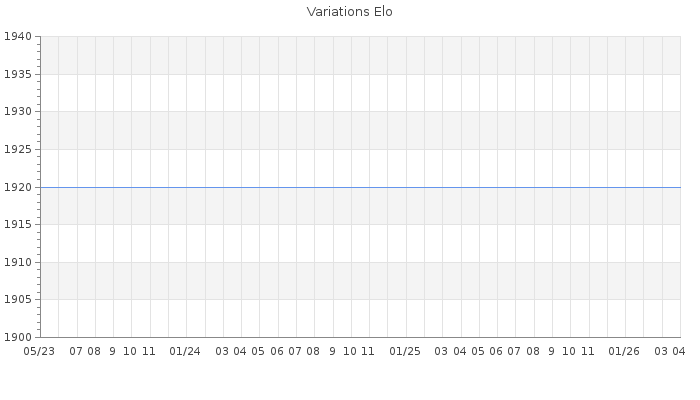Date d'inscription : 21/04/19. Donateur pour EchecsEmail : Non ( Cliquez ici pour soutenir EchecsEmail. ) Elo non arrondi:1858 ( 208 sur 447 joueurs ) Nombre de victoires :19 Nombre de nulles :1 Nombre de défaites :5 Rd ( Un petit rd indique un elo fiable ) : 104 Magic Elo:1700 Magic Rd : 350 Elo maximum atteint ( en étant classé ) :2080 Elo maximum atteint cette année :0 Nombre coups joués : 800 Inscrit dans l' équipe:Joueurs Interstitiels Classement coupe : Inactif Points coupe : 0 Classement Coupe Magic Chess : Inactif Points Coupe Magic Chess : 0 Tournoi échelle : Nombre de tournois gagnés :0