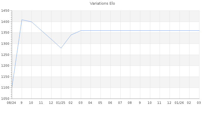 Date d'inscription : 08/08/24. Donateur pour EchecsEmail : Non ( Cliquez ici pour soutenir EchecsEmail. ) Elo non arrondi:1332.2 ( 445 sur 439 joueurs ) Nombre de victoires :10 Nombre de nulles :0 Nombre de défaites :10 Temps de réponse moyen par coup : 0J 7H 5M 34S ( Moyenne sur 1 coups ). Rd ( Un petit rd indique un elo fiable ) : 99 Elo maximum atteint ( en étant classé ) :1470 Elo maximum atteint cette année :0 Nombre coups joués : 769 Classement coupe : Inactif Points coupe : 0 Classement Coupe Magic Chess : Inactif Points Coupe Magic Chess : 0 Tournoi échelle : Nombre de tournois gagnés :0