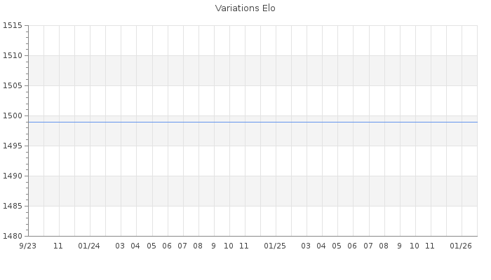 Date d'inscription : 10/09/23. Donateur pour EchecsEmail : Non ( Cliquez ici pour soutenir EchecsEmail. ) Elo non arrondi:1462 ( 423 sur 458 joueurs ) Nombre de victoires :0 Nombre de nulles :0 Nombre de défaites :0 Rd ( Un petit rd indique un elo fiable ) : 350 Elo maximum atteint ( en étant classé ) :0 Elo maximum atteint cette année :0 Nombre coups joués : 3 Classement coupe : Inactif Points coupe : 0 Classement Coupe Magic Chess : Inactif Points Coupe Magic Chess : 0 Tournoi échelle : Nombre de tournois gagnés :0