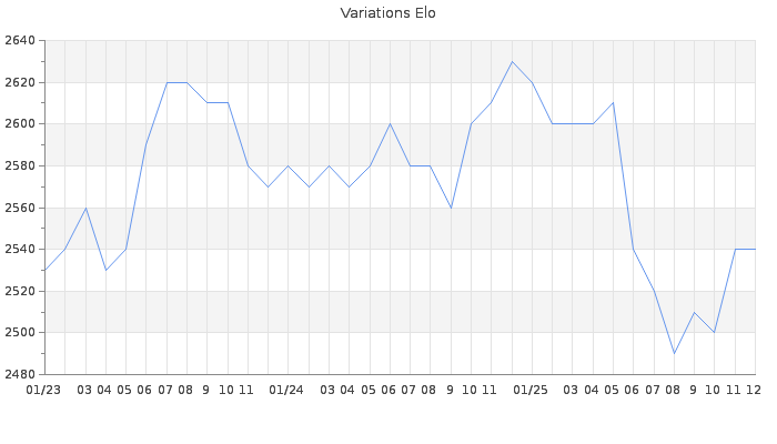 Date d'inscription : 18/11/15. Donateur pour EchecsEmail : Non ( Cliquez ici pour soutenir EchecsEmail. ) Elo non arrondi:2535.8 ( 20 sur 452 joueurs ) Nombre de victoires :630 Nombre de nulles :239 Nombre de défaites :294 Temps de réponse moyen par coup : 0J 13H 40M 39S ( Moyenne sur 550 coups ). Rd ( Un petit rd indique un elo fiable ) : 72 Magic Elo:1674.33 Magic Rd : 80 Elo maximum atteint ( en étant classé ) :2650 Elo maximum atteint cette année :2630 Nombre coups joués : 40534 Inscrit dans l' équipe:Mission Impossible Classement coupe : 20 Points coupe : 4189.21 Classement Coupe Magic Chess : Inactif Points Coupe Magic Chess : 0.51 Tournoi échelle : Inactif. Tournois gagnés : 17/11/2025 : Cat 4 : Premier au tournoi multi Halloween 2025 n°3 03/09/2022 : Cat 6 : Victoire dans le tournoi n°24044 02/08/2022 : Cat 6 : Victoire dans le tournoi n°23967 17/02/2021 : Cat 6 : Victoire dans le tournoi n°22287 21/11/2020 : Cat 6 : Victoire dans le tournoi n°21901 12/10/2020 : Cat 4 : Premier au tournoi multi Automne 2020 n°4 16/03/2020 : Cat 4 : Premier au tournoi multi Saint-Valentin 2020 n°4 30/06/2016 : Cat 5 : Victoire dans le tournoi n°15021 09/01/2016 : Cat 4 : Victoire dans le tournoi n°14126 01/12/2015 : Cat 2 : Victoire dans le tournoi n°18834 Nombre de tournois gagnés :13