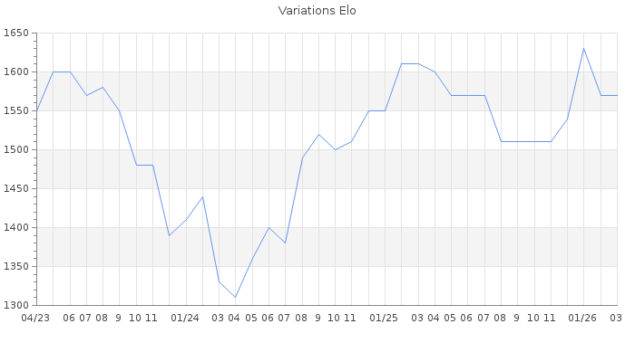 Date d'inscription : 07/11/20. Donateur pour EchecsEmail : Non ( Cliquez ici pour soutenir EchecsEmail. ) Elo non arrondi:1569.2 ( 334 sur 447 joueurs ) Nombre de victoires :419 Nombre de nulles :51 Nombre de défaites :445 Temps de réponse moyen par coup : 0J 5H 5M 2S ( Moyenne sur 1647 coups ). Rd ( Un petit rd indique un elo fiable ) : 58 Magic Elo:1700 Magic Rd : 350 Elo maximum atteint ( en étant classé ) :1660 Elo maximum atteint cette année :1660 Nombre coups joués : 30818 Inscrit dans l' équipe:les accrocheurs Classement coupe : Inactif Points coupe : 1.13 Classement Coupe Magic Chess : Inactif Points Coupe Magic Chess : 0 Tournoi échelle : Inactif. Tournois gagnés : 19/01/2026 : Cat 2 : Victoire dans le tournoi n°27371 06/01/2026 : Cat 2 : Victoire dans le tournoi n°27320 27/03/2025 : Cat 2 : Victoire dans le tournoi n°26508 17/02/2025 : Cat 2 : Victoire dans le tournoi n°26435 17/01/2025 : Cat 2 : Victoire dans le tournoi n°26296 15/01/2025 : Cat 2 : Victoire dans le tournoi n°26321 23/12/2024 : Cat 1 : Victoire dans le tournoi n°26190 04/11/2024 : Cat 1 : Victoire dans le tournoi n°26064 26/09/2024 : Cat 1 : Victoire dans le tournoi n°26045 03/09/2024 : Cat 2 : Victoire dans le tournoi n°26025 19/05/2024 : Cat 1 : Victoire dans le tournoi n°25756 28/07/2023 : Cat 2 : Victoire dans le tournoi n°24998 16/07/2023 : Cat 2 : Victoire dans le tournoi n°24963 20/05/2023 : Cat 2 : Victoire dans le tournoi n°24806 18/05/2023 : Cat 1 : Victoire dans le tournoi n°24757 02/04/2022 : Cat 2 : Victoire dans le tournoi n°23737 11/03/2022 : Cat 1 : Victoire dans le tournoi n°23713 11/03/2022 : Cat 1 : Victoire dans le tournoi n°23696 18/04/2021 : Cat 1 : Victoire dans le tournoi n°22438 04/01/2021 : Cat 1 : Victoire dans le tournoi n°22031 Nombre de tournois gagnés :20