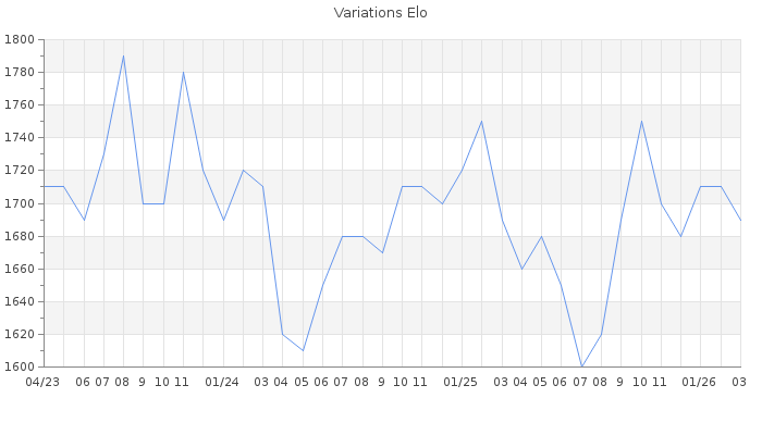 Date d'inscription : 16/03/10. Donateur pour EchecsEmail : Oui ( Cliquez ici pour soutenir EchecsEmail. ) Elo non arrondi:1687.6 ( 270 sur 440 joueurs ) Nombre de victoires :3816 Nombre de nulles :385 Nombre de défaites :3979 Temps de réponse moyen par coup : 0J 2H 40M 22S ( Moyenne sur 4099 coups ). Rd ( Un petit rd indique un elo fiable ) : 50 Magic Elo:1490.88 Magic Rd : 264 Elo maximum atteint ( en étant classé ) :1890 Elo maximum atteint cette année :1730 Nombre coups joués : 291949 Inscrit dans l' équipe:CHESS MASTER Classement coupe : Inactif Points coupe : 0 Classement Coupe Magic Chess : Inactif Points Coupe Magic Chess : 0 Tournoi échelle : Tournois gagnés : 12/03/2026 : Cat 3 : Victoire dans le tournoi n°27471 10/02/2026 : Cat 3 : Victoire dans le tournoi n°27382 09/12/2025 : Cat 3 : Victoire dans le tournoi n°27262 01/12/2025 : Cat 2 : Victoire dans le tournoi n°27003 18/10/2025 : Cat 3 : Victoire dans le tournoi n°27115 06/09/2025 : Cat 3 : Victoire dans le tournoi n°27028 26/01/2025 : Cat 3 : Victoire dans le tournoi n°26449 18/01/2025 : Cat 3 : Victoire dans le tournoi n°26420 08/08/2024 : Cat 2 : Victoire dans le tournoi n°25967 20/05/2024 : Cat 3 : Victoire dans le tournoi n°25709 05/02/2024 : Cat 3 : Victoire dans le tournoi n°25518 24/11/2023 : Cat 3 : Victoire dans le tournoi n°25367 07/10/2023 : Cat 3 : Victoire dans le tournoi n°25252 02/10/2023 : Cat 3 : Victoire dans le tournoi n°25212 24/07/2023 : Cat 3 : Victoire dans le tournoi n°25026 14/07/2023 : Cat 2 : Victoire dans le tournoi n°24988 01/05/2023 : Cat 3 : Victoire dans le tournoi n°24828 07/04/2023 : Cat 3 : Victoire dans le tournoi n°24755 01/01/2023 : Cat 3 : Victoire dans le tournoi n°24465 21/10/2022 : Cat 3 : Victoire dans le tournoi n°24032 14/10/2022 : Cat 3 : Victoire dans le tournoi n°24264 16/09/2022 : Cat 3 : Victoire dans le tournoi n°24243 02/09/2022 : Cat 3 : Victoire dans le tournoi n°24205 16/01/2022 : Cat 3 : Victoire dans le tournoi n°23407 19/11/2021 : Cat 3 : Victoire dans le tournoi n°23241 16/11/2021 : Cat 3 : Victoire dans le tournoi n°23352 09/10/2021 : Cat 3 : Victoire dans le tournoi n°23181 12/08/2021 : Cat 3 : Victoire dans le tournoi n°23011 11/02/2021 : Cat 3 : Victoire dans le tournoi n°22277 10/02/2021 : Cat 3 : Victoire dans le tournoi n°22323 01/02/2021 : Cat 2 : Victoire dans le tournoi n°22114 29/01/2021 : Cat 3 : Victoire dans le tournoi n°22299 11/01/2021 : Cat 3 : Victoire dans le tournoi n°22279 30/10/2020 : Cat 3 : Victoire dans le tournoi n°21918 29/10/2020 : Cat 3 : Victoire dans le tournoi n°21940 03/10/2020 : Cat 3 : Victoire dans le tournoi n°21839 26/09/2020 : Cat 3 : Victoire dans le tournoi n°21760 04/02/2020 : Cat 3 : Victoire dans le tournoi n°20646 13/11/2019 : Cat 3 : Victoire dans le tournoi n°20360 15/10/2019 : Cat 3 : Victoire dans le tournoi n°20185 02/10/2019 : Cat 3 : Victoire dans le tournoi n°20107 06/09/2019 : Cat 3 : Victoire dans le tournoi n°20037 11/08/2019 : Cat 3 : Victoire dans le tournoi n°19971 30/07/2019 : Cat 2 : Victoire dans le tournoi n°19731 03/04/2019 : Cat 2 : Victoire dans le tournoi n°19285 07/12/2018 : Cat 2 : Victoire dans le tournoi n°18738 25/11/2018 : Cat 3 : Victoire dans le tournoi n°18934 02/11/2018 : Cat 3 : Victoire dans le tournoi n°18859 05/10/2018 : Cat 3 : Victoire dans le tournoi n°18368 30/06/2018 : Cat 3 : Victoire dans le tournoi n°18056 01/04/2018 : Cat 3 : Victoire dans le tournoi n°17625 24/02/2018 : Cat 2 : Victoire dans le tournoi n°17538 04/08/2017 : Cat 2 : Victoire dans le tournoi n°16687 23/07/2017 : Cat 3 : Victoire dans le tournoi n°16837 25/06/2017 : Cat 2 : Victoire dans le tournoi n°16471 21/06/2017 : Cat 3 : Victoire dans le tournoi n°16620 06/06/2017 : Cat 2 : Victoire dans le tournoi n°16518 30/04/2016 : Cat 2 : Victoire dans le tournoi n°14315 05/04/2016 : Cat 3 : Victoire dans le tournoi n°14578 20/03/2016 : Cat 2 : Victoire dans le tournoi n°14317 06/02/2016 : Cat 2 : Victoire dans le tournoi n°14178 02/02/2016 : Cat 2 : Victoire dans le tournoi n°14234 22/01/2016 : Cat 2 : Victoire dans le tournoi n°18906 28/12/2015 : Cat 2 : Victoire dans le tournoi n°18898 09/12/2015 : Cat 2 : Victoire dans le tournoi n°18839 19/10/2015 : Cat 2 : Victoire dans le tournoi n°18412 12/08/2015 : Cat 3 : Victoire dans le tournoi n°18045 26/07/2015 : Cat 2 : Victoire dans le tournoi n°17969 25/07/2015 : Cat 2 : Victoire dans le tournoi n°17975 08/07/2015 : Cat 2 : Victoire dans le tournoi n°17859 02/06/2015 : Cat 2 : Victoire dans le tournoi n°17797 14/03/2015 : Cat 2 : Victoire dans le tournoi n°17246 24/02/2015 : Cat 3 : Victoire dans le tournoi n°16881 19/02/2015 : Cat 3 : Victoire dans le tournoi n°16882 11/12/2014 : Cat 2 : Victoire dans le tournoi n°16476 Nombre de tournois gagnés :75