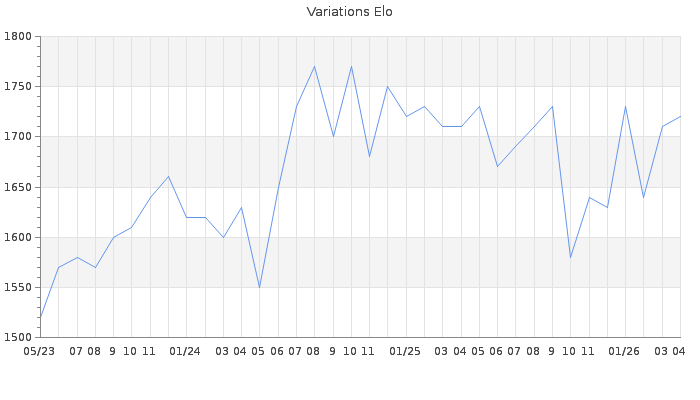 Date d'inscription : 18/05/09. Donateur pour EchecsEmail : Non ( Cliquez ici pour soutenir EchecsEmail. ) Elo non arrondi:1719.6 ( 259 sur 446 joueurs ) Nombre de victoires :5279 Nombre de nulles :1010 Nombre de défaites :5047 Temps de réponse moyen par coup : 0J 1H 12M 14S ( Moyenne sur 10073 coups ). Rd ( Un petit rd indique un elo fiable ) : 58 Magic Elo:1600 Magic Rd : 350 Elo maximum atteint ( en étant classé ) :1950 Elo maximum atteint cette année :1750 Nombre coups joués : 436204 Classement coupe : Inactif Points coupe : 0 Classement Coupe Magic Chess : Inactif Points Coupe Magic Chess : 0 Tournoi échelle : Tournois gagnés : 01/04/2026 : Cat 2 : Victoire dans le tournoi n°27557 16/03/2026 : Cat 2 : Victoire dans le tournoi n°27513 15/03/2026 : Cat 2 : Victoire dans le tournoi n°27497 14/03/2026 : Cat 2 : Victoire dans le tournoi n°27379 13/03/2026 : Cat 2 : Victoire dans le tournoi n°27481 07/03/2026 : Cat 3 : Victoire dans le tournoi n°27428 02/03/2026 : Cat 2 : Victoire dans le tournoi n°27482 28/02/2026 : Cat 2 : Victoire dans le tournoi n°27490 12/02/2026 : Cat 2 : Victoire dans le tournoi n°27412 11/02/2026 : Cat 2 : Victoire dans le tournoi n°27427 31/01/2026 : Cat 2 : Victoire dans le tournoi n°27422 18/01/2026 : Cat 2 : Victoire dans le tournoi n°27341 18/01/2026 : Cat 2 : Victoire dans le tournoi n°27354 13/01/2026 : Cat 2 : Victoire dans le tournoi n°27314 13/01/2026 : Cat 2 : Victoire dans le tournoi n°27377 06/01/2026 : Cat 2 : Victoire dans le tournoi n°27362 01/01/2026 : Cat 2 : Victoire dans le tournoi n°27303 31/12/2025 : Cat 2 : Victoire dans le tournoi n°27333 29/12/2025 : Cat 2 : Victoire dans le tournoi n°27278 19/12/2025 : Cat 2 : Victoire dans le tournoi n°27280 16/12/2025 : Cat 2 : Victoire dans le tournoi n°27291 30/11/2025 : Cat 2 : Victoire dans le tournoi n°27241 27/11/2025 : Cat 2 : Victoire dans le tournoi n°27239 26/11/2025 : Cat 2 : Victoire dans le tournoi n°27233 25/11/2025 : Cat 2 : Victoire dans le tournoi n°27227 14/11/2025 : Cat 2 : Victoire dans le tournoi n°27191 22/10/2025 : Cat 2 : Victoire dans le tournoi n°27138 04/10/2025 : Cat 3 : Victoire dans le tournoi n°27108 04/10/2025 : Cat 3 : Victoire dans le tournoi n°27054 29/09/2025 : Cat 3 : Victoire dans le tournoi n°27065 27/09/2025 : Cat 3 : Victoire dans le tournoi n°27044 23/09/2025 : Cat 2 : Victoire dans le tournoi n°26954 14/09/2025 : Cat 2 : Victoire dans le tournoi n°27034 11/09/2025 : Cat 3 : Victoire dans le tournoi n°27045 10/09/2025 : Cat 2 : Victoire dans le tournoi n°27012 10/09/2025 : Cat 2 : Victoire dans le tournoi n°27012 30/08/2025 : Cat 2 : Victoire dans le tournoi n°26994 23/08/2025 : Cat 2 : Victoire dans le tournoi n°26974 14/08/2025 : Cat 3 : Victoire dans le tournoi n°26921 13/08/2025 : Cat 3 : Victoire dans le tournoi n°26959 22/07/2025 : Cat 3 : Victoire dans le tournoi n°26861 17/07/2025 : Cat 3 : Victoire dans le tournoi n°26881 12/07/2025 : Cat 2 : Victoire dans le tournoi n°26869 05/07/2025 : Cat 2 : Victoire dans le tournoi n°26824 17/06/2025 : Cat 3 : Victoire dans le tournoi n°26690 14/06/2025 : Cat 2 : Victoire dans le tournoi n°26798 05/06/2025 : Cat 3 : Victoire dans le tournoi n°26754 30/05/2025 : Cat 3 : Victoire dans le tournoi n°26674 04/05/2025 : Cat 3 : Victoire dans le tournoi n°26724 27/04/2025 : Cat 2 : Victoire dans le tournoi n°26697 27/04/2025 : Cat 2 : Victoire dans le tournoi n°26661 18/03/2025 : Cat 3 : Victoire dans le tournoi n°26604 27/02/2025 : Cat 3 : Victoire dans le tournoi n°26517 23/02/2025 : Cat 3 : Victoire dans le tournoi n°26465 11/02/2025 : Cat 3 : Victoire dans le tournoi n°26496 09/02/2025 : Cat 3 : Victoire dans le tournoi n°26498 09/02/2025 : Cat 3 : Victoire dans le tournoi n°26480 08/02/2025 : Cat 2 : Victoire dans le tournoi n°26478 05/02/2025 : Cat 3 : Victoire dans le tournoi n°26468 29/01/2025 : Cat 3 : Victoire dans le tournoi n°26437 21/01/2025 : Cat 3 : Victoire dans le tournoi n°26442 20/01/2025 : Cat 3 : Victoire dans le tournoi n°26383 18/01/2025 : Cat 3 : Victoire dans le tournoi n°26363 20/12/2024 : Cat 3 : Victoire dans le tournoi n°26301 18/12/2024 : Cat 3 : Victoire dans le tournoi n°26332 12/12/2024 : Cat 3 : Victoire dans le tournoi n°26305 30/11/2024 : Cat 2 : Victoire dans le tournoi n°26261 13/11/2024 : Cat 3 : Victoire dans le tournoi n°26222 11/11/2024 : Cat 2 : Victoire dans le tournoi n°26150 31/10/2024 : Cat 3 : Victoire dans le tournoi n°26000 30/10/2024 : Cat 3 : Victoire dans le tournoi n°26058 21/10/2024 : Cat 3 : Victoire dans le tournoi n°26143 15/10/2024 : Cat 2 : Victoire dans le tournoi n°26151 10/10/2024 : Cat 2 : Victoire dans le tournoi n°25923 29/09/2024 : Cat 3 : Victoire dans le tournoi n°26071 29/09/2024 : Cat 3 : Victoire dans le tournoi n°26051 16/09/2024 : Cat 2 : Victoire dans le tournoi n°25908 21/08/2024 : Cat 2 : Victoire dans le tournoi n°25950 15/08/2024 : Cat 2 : Victoire dans le tournoi n°25985 13/08/2024 : Cat 2 : Victoire dans le tournoi n°25962 13/08/2024 : Cat 2 : Victoire dans le tournoi n°25911 08/08/2024 : Cat 2 : Victoire dans le tournoi n°25956 23/07/2024 : Cat 2 : Victoire dans le tournoi n°25889 13/07/2024 : Cat 2 : Victoire dans le tournoi n°25931 26/06/2024 : Cat 2 : Victoire dans le tournoi n°25880 24/06/2024 : Cat 2 : Victoire dans le tournoi n°25855 20/06/2024 : Cat 2 : Victoire dans le tournoi n°25814 24/05/2024 : Cat 2 : Victoire dans le tournoi n°25742 20/04/2024 : Cat 2 : Victoire dans le tournoi n°25733 08/04/2024 : Cat 2 : Victoire dans le tournoi n°25677 26/03/2024 : Cat 2 : Victoire dans le tournoi n°25619 17/03/2024 : Cat 2 : Victoire dans le tournoi n°25608 14/03/2024 : Cat 2 : Victoire dans le tournoi n°25499 06/03/2024 : Cat 2 : Victoire dans le tournoi n°25565 15/02/2024 : Cat 2 : Victoire dans le tournoi n°25549 10/02/2024 : Cat 2 : Victoire dans le tournoi n°25467 07/02/2024 : Cat 2 : Victoire dans le tournoi n°25543 28/12/2023 : Cat 