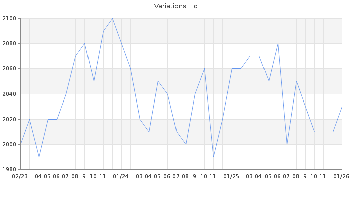 Date d'inscription : 04/02/14. Donateur pour EchecsEmail : Non ( Cliquez ici pour soutenir EchecsEmail. ) Elo non arrondi:2026.6 ( 121 sur 462 joueurs ) Nombre de victoires :922 Nombre de nulles :459 Nombre de défaites :523 Temps de réponse moyen par coup : 0J 5H 58M 17S ( Moyenne sur 1137 coups ). Rd ( Un petit rd indique un elo fiable ) : 56 Elo maximum atteint ( en étant classé ) :2160 Elo maximum atteint cette année :2030 Nombre coups joués : 77392 Classement coupe : Inactif, date de la dernière qualification : 29/01/22 Points coupe : 7.96 Classement Coupe Magic Chess : Inactif Points Coupe Magic Chess : 0 Tournoi échelle : Inactif. Tournois gagnés : 16/01/2026 : Cat 4 : Victoire dans le tournoi n°27318 17/09/2025 : Cat 4 : Victoire dans le tournoi n°27013 15/09/2025 : Cat 4 : Victoire dans le tournoi n°26961 01/09/2025 : Cat 4 : Victoire dans le tournoi n°26993 04/08/2025 : Cat 4 : Victoire dans le tournoi n°26893 29/06/2025 : Cat 4 : Victoire dans le tournoi n°26816 12/02/2025 : Cat 4 : Victoire dans le tournoi n°26429 02/02/2025 : Cat 4 : Victoire dans le tournoi n°26319 19/01/2025 : Cat 4 : Victoire dans le tournoi n°26290 31/12/2024 : Cat 4 : Victoire dans le tournoi n°26293 22/11/2024 : Cat 4 : Victoire dans le tournoi n°26107 10/10/2024 : Cat 4 : Victoire dans le tournoi n°26040 24/09/2024 : Cat 4 : Victoire dans le tournoi n°26054 20/06/2024 : Cat 4 : Victoire dans le tournoi n°25829 10/06/2024 : Cat 4 : Victoire dans le tournoi n°25852 09/05/2024 : Cat 4 : Victoire dans le tournoi n°25743 14/04/2024 : Cat 4 : Victoire dans le tournoi n°25688 04/01/2024 : Cat 4 : Victoire dans le tournoi n°25450 04/10/2023 : Cat 4 : Victoire dans le tournoi n°25218 16/09/2023 : Cat 4 : Victoire dans le tournoi n°25145 29/08/2023 : Cat 4 : Victoire dans le tournoi n°25099 26/08/2023 : Cat 4 : Victoire dans le tournoi n°25107 08/06/2023 : Cat 4 : Victoire dans le tournoi n°24891 18/04/2023 : Cat 4 : Victoire dans le tournoi n°24738 28/03/2023 : Cat 4 : Victoire dans le tournoi n°24563 24/03/2023 : Cat 4 : Victoire dans le tournoi n°24677 22/02/2023 : Cat 4 : Victoire dans le tournoi n°24575 18/12/2022 : Cat 4 : Victoire dans le tournoi n°24452 24/11/2022 : Cat 4 : Victoire dans le tournoi n°24338 05/11/2022 : Cat 4 : Victoire dans le tournoi n°24317 17/07/2022 : Cat 4 : Victoire dans le tournoi n°23942 01/07/2022 : Cat 4 : Victoire dans le tournoi n°23988 27/06/2022 : Cat 4 : Victoire dans le tournoi n°23875 31/05/2022 : Cat 4 : Victoire dans le tournoi n°23926 25/05/2022 : Cat 4 : Victoire dans le tournoi n°23848 29/01/2022 : Cat 5 : Victoire dans le tournoi n°23439 17/01/2022 : Cat 4 : Victoire dans le tournoi n°23391 22/11/2021 : Cat 4 : Victoire dans le tournoi n°23307 13/11/2021 : Cat 4 : Victoire dans le tournoi n°23213 10/11/2021 : Cat 4 : Victoire dans le tournoi n°23257 10/11/2021 : Cat 4 : Victoire dans le tournoi n°23257 22/10/2021 : Cat 4 : Victoire dans le tournoi n°23158 16/08/2021 : Cat 4 : Victoire dans le tournoi n°22982 11/07/2021 : Cat 4 : Victoire dans le tournoi n°22814 09/06/2021 : Cat 4 : Victoire dans le tournoi n°22755 02/03/2021 : Cat 4 : Victoire dans le tournoi n°22374 24/01/2021 : Cat 5 : Victoire dans le tournoi n°22235 07/01/2021 : Cat 4 : Victoire dans le tournoi n°22215 01/01/2021 : Cat 4 : Victoire dans le tournoi n°22073 03/12/2020 : Cat 4 : Victoire dans le tournoi n°21910 26/11/2020 : Cat 4 : Victoire dans le tournoi n°21925 16/11/2020 : Cat 4 : Victoire dans le tournoi n°21931 26/10/2020 : Cat 4 : Victoire dans le tournoi n°21808 19/10/2020 : Cat 4 : Victoire dans le tournoi n°21684 15/10/2020 : Cat 4 : Victoire dans le tournoi n°21705 25/09/2020 : Cat 5 : Victoire dans le tournoi n°21533 02/05/2020 : Cat 5 : Victoire dans le tournoi n°21008 09/03/2020 : Cat 5 : Victoire dans le tournoi n°20817 29/02/2020 : Cat 5 : Victoire dans le tournoi n°20545 09/08/2019 : Cat 5 : Victoire dans le tournoi n°19886 06/07/2019 : Cat 5 : Victoire dans le tournoi n°19589 21/06/2019 : Cat 4 : Victoire dans le tournoi n°19404 13/03/2019 : Cat 4 : Victoire dans le tournoi n°19266 23/02/2019 : Cat 4 : Victoire dans le tournoi n°19263 23/02/2019 : Cat 4 : Victoire dans le tournoi n°19214 17/02/2019 : Cat 4 : Victoire dans le tournoi n°18995 01/01/2019 : Cat 4 : Victoire dans le tournoi n°19072 13/11/2018 : Cat 4 : Victoire dans le tournoi n°18890 09/11/2018 : Cat 4 : Victoire dans le tournoi n°18786 29/10/2018 : Cat 4 : Victoire dans le tournoi n°18730 06/10/2018 : Cat 4 : Victoire dans le tournoi n°18655 25/09/2018 : Cat 4 : Victoire dans le tournoi n°18503 13/09/2018 : Cat 4 : Victoire dans le tournoi n°18547 01/09/2018 : Cat 4 : Victoire dans le tournoi n°18540 26/08/2018 : Cat 4 : Victoire dans le tournoi n°18389 11/08/2018 : Cat 4 : Victoire dans le tournoi n°18382 03/08/2018 : Cat 4 : Victoire dans le tournoi n°18200 29/12/2017 : Cat 4 : Victoire dans le tournoi n°17424 22/12/2017 : Cat 4 : Victoire dans le tournoi n°17364 22/12/2017 : Cat 4 : Victoire dans le tournoi n°17356 22/12/2017 : Cat 4 : Victoire dans le tournoi n°17317 30/11/2017 : Cat 4 : Victoire dans le tournoi n°17133 16/11/2017 : Cat 4 : Victoire dans le tournoi n°17281 08/09/2017 : Cat 4 : Victoire dans le tournoi n°16858 27/08/2017 : Cat 4 : Victoire dans le tournoi n°16839 01/07/2017 : Cat 5 : Victoire dans le tournoi n°16171 12/04/2016 : Cat 5 : Victoire dans le tournoi n°14521 16/12/2015 : Cat 4 : Victoire dans le tournoi n°18782 14/11/2015 : Cat 4 : Victoire dans le tournoi n°18564 14/11/2015 : Cat 4 : Victoire dans le tournoi n°17984 31/10/2015 : Cat 4 : Victoire dans le tournoi n°18597 14/08/2015 : Cat 4 : Victoire dans le tournoi n°17876 10/08/2015 : Cat 4 : Victoire dans le tournoi n°17976 06/07/2015 : Cat 4 : Victoire dans le tournoi n°17671 01/05/2015 : Cat 4 : Victoire dans le tournoi n°17253 23/12/2014 : Cat 4 : Victoire dans le tournoi n°16632 08/12/2014 : Cat 4 : Victoire dans le tournoi n