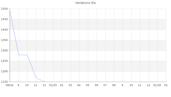 Date d'inscription : 18/08/24. Donateur pour EchecsEmail : Non ( Cliquez ici pour soutenir EchecsEmail. ) Elo non arrondi:1120.3 ( 484 sur 458 joueurs ) Nombre de victoires :0 Nombre de nulles :0 Nombre de défaites :10 Temps de réponse moyen par coup : 0J 3H 41M 47S ( Moyenne sur 0 coups ). Rd ( Un petit rd indique un elo fiable ) : 129 Elo maximum atteint ( en étant classé ) :1210 Elo maximum atteint cette année :0 Nombre coups joués : 97 Classement coupe : Inactif Points coupe : 0 Classement Coupe Magic Chess : Inactif Points Coupe Magic Chess : 0 Tournoi échelle : Nombre de tournois gagnés :0