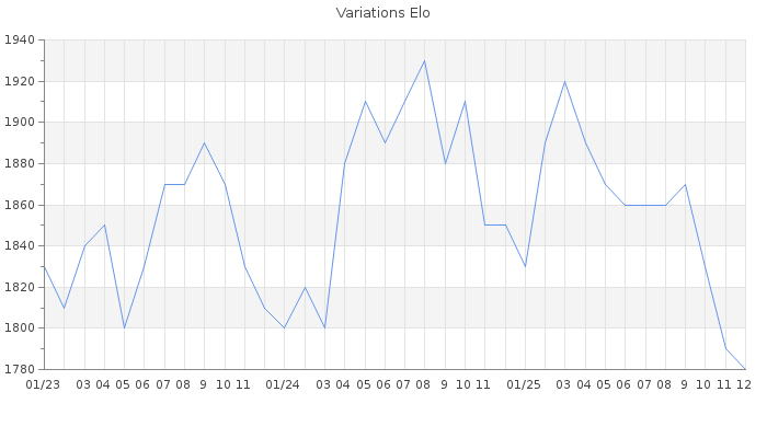 Date d'inscription : Avant le 20/12/05. Donateur pour EchecsEmail : Non ( Cliquez ici pour soutenir EchecsEmail. ) Elo non arrondi:1781.9 ( 227 sur 448 joueurs ) Nombre de victoires :1830 Nombre de nulles :184 Nombre de défaites :1425 Temps de réponse moyen par coup : 0J 9H 6M 55S ( Moyenne sur 751 coups ). Rd ( Un petit rd indique un elo fiable ) : 63 Magic Elo:1391.61 Magic Rd : 329 Elo maximum atteint ( en étant classé ) :1990 Elo maximum atteint cette année :1930 Nombre coups joués : 115310 Classement coupe : Inactif, date de la dernière qualification : 18/10/23 Points coupe : 2.57 Classement Coupe Magic Chess : Inactif Points Coupe Magic Chess : 0 Tournoi échelle : Inactif. Tournois gagnés : 25/08/2024 : Cat 3 : Victoire dans le tournoi n°25929 30/08/2023 : Cat 3 : Victoire dans le tournoi n°25095 28/08/2023 : Cat 3 : Victoire dans le tournoi n°25058 19/05/2023 : Cat 4 : Victoire dans le tournoi n°24827 29/05/2022 : Cat 4 : Victoire dans le tournoi n°23831 24/02/2022 : Cat 4 : Victoire dans le tournoi n°23471 22/12/2021 : Cat 4 : Victoire dans le tournoi n°23355 19/03/2021 : Cat 3 : Victoire dans le tournoi n°22268 12/05/2020 : Cat 3 : Victoire dans le tournoi n°21145 15/04/2020 : Cat 3 : Victoire dans le tournoi n°21078 12/04/2020 : Cat 3 : Victoire dans le tournoi n°20858 27/01/2020 : Cat 3 : Victoire dans le tournoi n°20584 14/10/2019 : Cat 3 : Victoire dans le tournoi n°20133 22/06/2019 : Cat 4 : Victoire dans le tournoi n°19780 13/05/2019 : Cat 3 : Victoire dans le tournoi n°19579 08/05/2019 : Cat 3 : Victoire dans le tournoi n°19587 11/04/2019 : Cat 4 : Victoire dans le tournoi n°19029 15/03/2019 : Cat 3 : Victoire dans le tournoi n°19381 14/11/2018 : Cat 3 : Victoire dans le tournoi n°18851 31/10/2018 : Cat 3 : Victoire dans le tournoi n°18825 20/09/2018 : Cat 3 : Victoire dans le tournoi n°18693 23/04/2018 : Cat 2 : Victoire dans le tournoi n°17901 21/03/2018 : Cat 2 : Victoire dans le tournoi n°17724 07/03/2018 : Cat 2 : Victoire dans le tournoi n°17582 27/07/2017 : Cat 3 : Victoire dans le tournoi n°16849 22/03/2017 : Cat 2 : Victoire dans le tournoi n°15958 11/03/2017 : Cat 2 : Victoire dans le tournoi n°16169 04/03/2017 : Cat 2 : Victoire dans le tournoi n°16104 06/10/2016 : Cat 3 : Victoire dans le tournoi n°15215 13/05/2016 : Cat 2 : Victoire dans le tournoi n°14750 18/04/2016 : Cat 2 : Victoire dans le tournoi n°14652 29/02/2016 : Cat 3 : Victoire dans le tournoi n°14279 31/01/2016 : Cat 3 : Victoire dans le tournoi n°14075 07/12/2015 : Cat 3 : Victoire dans le tournoi n°18689 08/11/2015 : Cat 2 : Victoire dans le tournoi n°18502 22/07/2015 : Cat 3 : Victoire dans le tournoi n°17897 25/04/2015 : Cat 3 : Victoire dans le tournoi n°17271 23/10/2014 : Cat 3 : Victoire dans le tournoi n°15925 28/08/2014 : Cat 3 : Victoire dans le tournoi n°15572 12/06/2014 : Cat 3 : Victoire dans le tournoi n°15272 29/04/2014 : Cat 3 : Victoire dans le tournoi n°14878 10/04/2007 : Cat 2 : Victoire dans le tournoi n°3684 02/11/2005 : Cat 3 : Victoire dans le tournoi n°1305 12/11/2003 : Cat 2 : Victoire dans le tournoi n°505 Nombre de tournois gagnés :44
