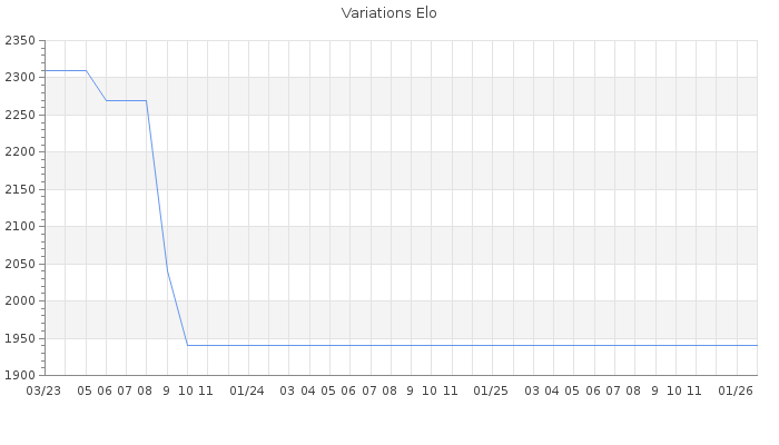 Date d'inscription : 15/05/20. Donateur pour EchecsEmail : Non ( Cliquez ici pour soutenir EchecsEmail. ) Elo non arrondi:1909.3 ( 179 sur 458 joueurs ) Nombre de victoires :186 Nombre de nulles :24 Nombre de défaites :98 Temps de réponse moyen par coup : 1J 8H 23M 34S ( Moyenne sur 0 coups ). Rd ( Un petit rd indique un elo fiable ) : 73 Magic Elo:1421.62 Magic Rd : 265 Elo maximum atteint ( en étant classé ) :2320 Elo maximum atteint cette année :0 Nombre coups joués : 8581 Classement coupe : Inactif, date de la dernière qualification : 30/01/23 Points coupe : 82.21 Classement Coupe Magic Chess : Inactif Points Coupe Magic Chess : 0 Tournoi échelle : Inactif. Tournois gagnés : 18/01/2021 : Cat 5 : Victoire dans le tournoi n°22208 14/11/2020 : Cat 5 : Victoire dans le tournoi n°21904 24/06/2020 : Cat 5 : Victoire dans le tournoi n°21395 12/06/2020 : Cat 3 : Victoire dans le tournoi n°21336 30/05/2020 : Cat 3 : Victoire dans le tournoi n°21334 22/05/2020 : Cat 1 : Victoire dans le tournoi n°21297 Nombre de tournois gagnés :6