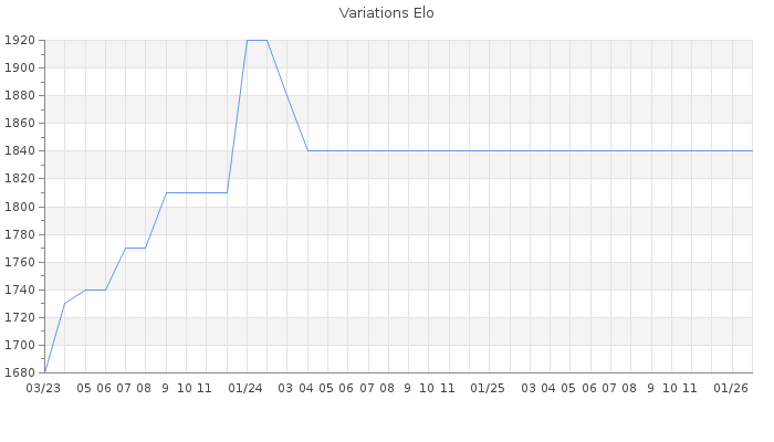 Date d'inscription : 04/11/12. Donateur pour EchecsEmail : Non ( Cliquez ici pour soutenir EchecsEmail. ) Elo non arrondi:1807.9 ( 231 sur 459 joueurs ) Nombre de victoires :192 Nombre de nulles :19 Nombre de défaites :188 Temps de réponse moyen par coup : 1J 9H 37M 18S ( Moyenne sur 1 coups ). Rd ( Un petit rd indique un elo fiable ) : 117 Magic Elo:1600 Magic Rd : 350 Elo maximum atteint ( en étant classé ) :1920 Elo maximum atteint cette année :0 Nombre coups joués : 19813 Inscrit dans l' équipe:Ardeche terre d audace Classement coupe : Inactif Points coupe : 0 Classement Coupe Magic Chess : Inactif Points Coupe Magic Chess : 0 Tournoi échelle : Inactif. Tournois gagnés : 19/03/2019 : Cat 2 : Victoire dans le tournoi n°19015 02/09/2017 : Cat 2 : Victoire dans le tournoi n°16836 08/04/2016 : Cat 2 : Victoire dans le tournoi n°14346 08/01/2014 : Cat 2 : Victoire dans le tournoi n°14103 18/02/2013 : Cat 1 : Victoire dans le tournoi n°11677 Nombre de tournois gagnés :5