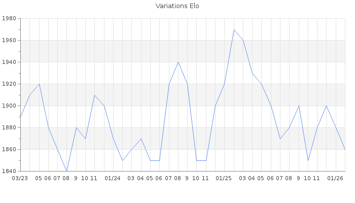 Date d'inscription : 05/04/07. Donateur pour EchecsEmail : Oui ( Cliquez ici pour soutenir EchecsEmail. ) Elo non arrondi:1860.9 ( 202 sur 461 joueurs ) Nombre de victoires :2029 Nombre de nulles :191 Nombre de défaites :1673 Temps de réponse moyen par coup : 0J 11H 24M 2S ( Moyenne sur 1073 coups ). Rd ( Un petit rd indique un elo fiable ) : 61 Magic Elo:1600 Magic Rd : 350 Elo maximum atteint ( en étant classé ) :2000 Elo maximum atteint cette année :1900 Nombre coups joués : 123882 Inscrit dans l' équipe:Les Rois du Succes Classement coupe : Inactif, date de la dernière qualification : 19/01/23 Points coupe : 9.07 Classement Coupe Magic Chess : Inactif Points Coupe Magic Chess : 0 Tournoi échelle : Inactif. Tournois gagnés : 16/11/2025 : Cat 3 : Victoire dans le tournoi n°27188 06/05/2021 : Cat 3 : Victoire dans le tournoi n°22549 18/11/2020 : Cat 4 : Victoire dans le tournoi n°22008 08/10/2020 : Cat 4 : Victoire dans le tournoi n°21836 10/06/2020 : Cat 3 : Victoire dans le tournoi n°21332 20/04/2020 : Cat 3 : Victoire dans le tournoi n°21021 12/10/2018 : Cat 4 : Victoire dans le tournoi n°18716 12/09/2018 : Cat 3 : Victoire dans le tournoi n°18561 18/06/2016 : Cat 3 : Victoire dans le tournoi n°14898 21/03/2016 : Cat 3 : Victoire dans le tournoi n°14458 06/03/2016 : Cat 3 : Victoire dans le tournoi n°14444 Nombre de tournois gagnés :11