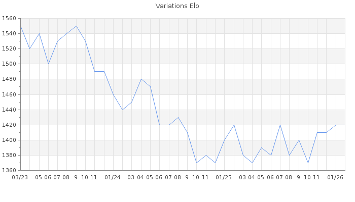 Date d'inscription : 11/06/16. Donateur pour EchecsEmail : Non ( Cliquez ici pour soutenir EchecsEmail. ) Elo non arrondi:1418.8 ( 406 sur 461 joueurs ) Nombre de victoires :189 Nombre de nulles :4 Nombre de défaites :149 Temps de réponse moyen par coup : 0J 4H 27M 21S ( Moyenne sur 244 coups ). Rd ( Un petit rd indique un elo fiable ) : 81 Elo maximum atteint ( en étant classé ) :1560 Elo maximum atteint cette année :1420 Nombre coups joués : 12636 Classement coupe : Inactif Points coupe : 0 Classement Coupe Magic Chess : Inactif Points Coupe Magic Chess : 0 Tournoi échelle : Nombre de tournois gagnés :0