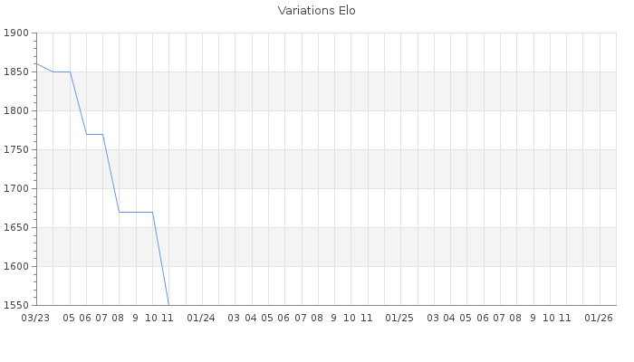 Date d'inscription : 24/05/19. Donateur pour EchecsEmail : Non ( Cliquez ici pour soutenir EchecsEmail. ) Elo non arrondi:1521.1 ( 404 sur 459 joueurs ) Nombre de victoires :12 Nombre de nulles :1 Nombre de défaites :30 Temps de réponse moyen par coup : 0J 7H 0M 36S ( Moyenne sur 0 coups ). Rd ( Un petit rd indique un elo fiable ) : 95 Elo maximum atteint ( en étant classé ) :1940 Elo maximum atteint cette année :0 Nombre coups joués : 853 Classement coupe : Inactif Points coupe : 0 Classement Coupe Magic Chess : Inactif Points Coupe Magic Chess : 0 Tournoi échelle : Nombre de tournois gagnés :0