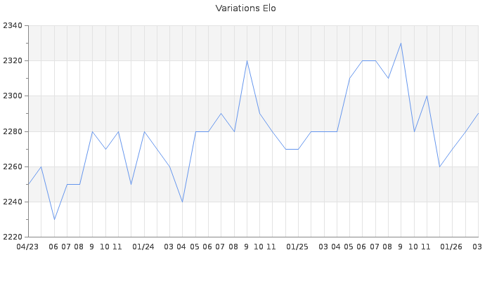 Date d'inscription : 04/11/13. Donateur pour EchecsEmail : Non ( Cliquez ici pour soutenir EchecsEmail. ) Elo non arrondi:2290.9 ( 46 sur 448 joueurs ) Nombre de victoires :1285 Nombre de nulles :319 Nombre de défaites :857 Temps de réponse moyen par coup : 0J 2H 7M 59S ( Moyenne sur 1857 coups ). Rd ( Un petit rd indique un elo fiable ) : 50 Magic Elo:1600 Magic Rd : 350 Elo maximum atteint ( en étant classé ) :2350 Elo maximum atteint cette année :2300 Nombre coups joués : 80721 Inscrit dans l' équipe:modesty Classement coupe : 13 Points coupe : 8084.22 Classement Coupe Magic Chess : Inactif Points Coupe Magic Chess : 0 Tournoi échelle : Inactif. Tournois gagnés : 22/03/2026 : Cat 5 : Victoire dans le tournoi n°27510 04/11/2024 : Cat 5 : Victoire dans le tournoi n°26168 18/10/2023 : Cat 5 : Victoire dans le tournoi n°25228 12/02/2023 : Cat 5 : Victoire dans le tournoi n°24578 15/06/2021 : Cat 4 : Victoire CC Mar21 Asc 06/04/2021 : Cat 4 : Victoire dans le tournoi n°22427 19/01/2021 : Cat 4 : Victoire dans le tournoi n°22266 17/03/2020 : Cat 4 : Victoire dans le tournoi n°20903 17/07/2019 : Cat 4 : Victoire CC Juin19 Asc 09/02/2019 : Cat 4 : Victoire dans le tournoi n°19089 18/12/2018 : Cat 4 : Victoire CC Nov18 Asc 24/09/2018 : Cat 4 : Victoire dans le tournoi n°18674 09/07/2018 : Cat 4 : Victoire dans le tournoi n°18356 08/07/2018 : Cat 4 : Victoire dans le tournoi n°18391 07/07/2018 : Cat 4 : Victoire dans le tournoi n°18342 27/06/2018 : Cat 4 : Victoire dans le tournoi n°18252 18/05/2018 : Cat 4 : Victoire dans le tournoi n°18125 30/04/2018 : Cat 4 : Victoire dans le tournoi n°17868 24/02/2018 : Cat 4 : Victoire dans le tournoi n°17629 11/09/2017 : Cat 5 : Victoire dans le tournoi n°16683 14/06/2017 : Cat 4 : Victoire dans le tournoi n°16589 09/12/2016 : Cat 4 : Victoire dans le tournoi n°15643 28/09/2016 : Cat 4 : Victoire dans le tournoi n°15356 01/01/2016 : Cat 5 : Victoire dans le tournoi n°18799 08/12/2015 : Cat 4 : Victoire dans le tournoi n°18735 16/11/2015 : Cat 4 : Victoire dans le tournoi n°18578 07/09/2015 : Cat 4 : Victoire dans le tournoi n°18155 04/08/2015 : Cat 4 : Victoire dans le tournoi n°17902 15/06/2015 : Cat 4 : Victoire dans le tournoi n°17497 23/04/2015 : Cat 4 : Victoire dans le tournoi n°17508 21/03/2015 : Cat 4 : Victoire dans le tournoi n°17141 04/11/2014 : Cat 5 : Victoire dans le tournoi n°16377 07/08/2014 : Cat 5 : Victoire dans le tournoi n°15462 09/02/2014 : Cat 5 : Victoire dans le tournoi n°14442 26/01/2014 : Cat 4 : Victoire dans le tournoi n°13868 12/12/2013 : Cat 4 : Victoire dans le tournoi n°13904 27/11/2013 : Cat 3 : Victoire dans le tournoi n°13848 21/11/2013 : Cat 4 : Victoire dans le tournoi n°13931 Nombre de tournois gagnés :38