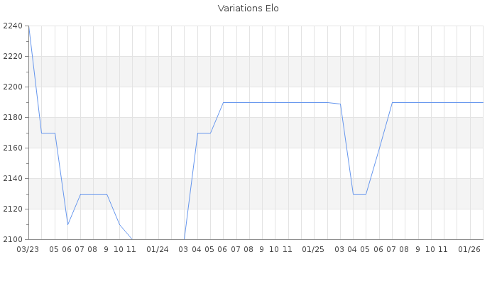 Date d'inscription : 11/08/09. Donateur pour EchecsEmail : Oui ( Cliquez ici pour soutenir EchecsEmail. ) Elo non arrondi:2173.5 ( 66 sur 463 joueurs ) Nombre de victoires :251 Nombre de nulles :62 Nombre de défaites :135 Temps de réponse moyen par coup : 0J 10H 9M 14S ( Moyenne sur 33 coups ). Rd ( Un petit rd indique un elo fiable ) : 119 Magic Elo:1864.62 Magic Rd : 80 Elo maximum atteint ( en étant classé ) :2250 Elo maximum atteint cette année :0 Nombre coups joués : 14342 Inscrit dans l' équipe:La Crim Team Classement coupe : Inactif Points coupe : 0.16 Classement Coupe Magic Chess : Inactif Points Coupe Magic Chess : 0 Tournoi échelle : Inactif. Tournois gagnés : 05/09/2016 : Cat 4 : Victoire dans le tournoi n°14994 03/06/2011 : Cat 4 : Victoire dans le tournoi n°8673 01/04/2010 : Cat 4 : Victoire dans le tournoi n°7038 09/03/2010 : Cat 4 : Victoire dans le tournoi n°7012 14/01/2010 : Cat 3 : Victoire dans le tournoi n°6761 03/10/2009 : Cat 2 : Victoire dans le tournoi n°6333 Nombre de tournois gagnés :6